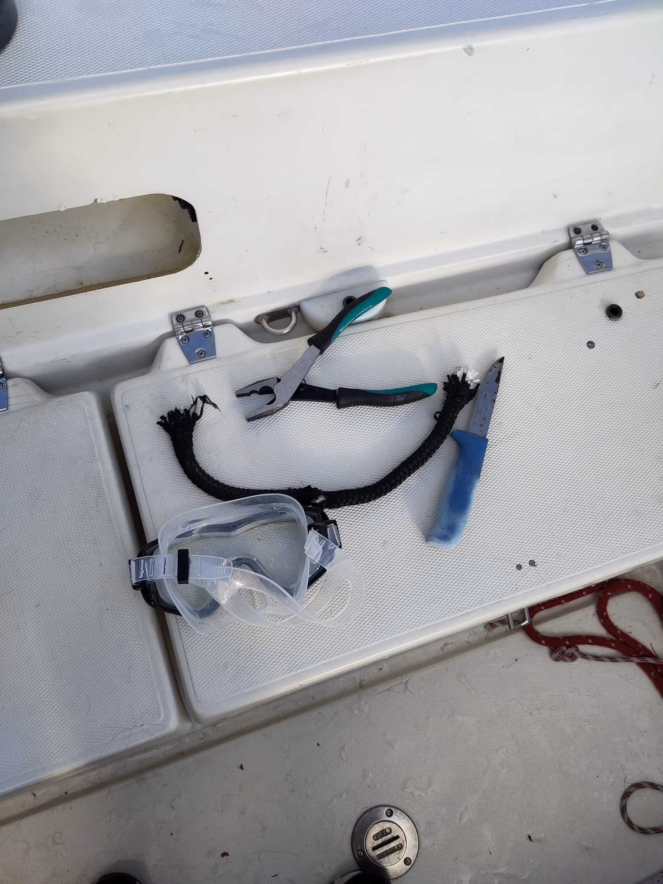 Once securely moored sideways, I contacted the season sailors support again 😅. In the morning, I dived again and followed the advice I'd been given: cut the line, try to manually rotate the propeller, and finally I managed to wrestle it out. Once out of the water, I checked that the engine was indeed running, shouted loudly of happiness and relief.