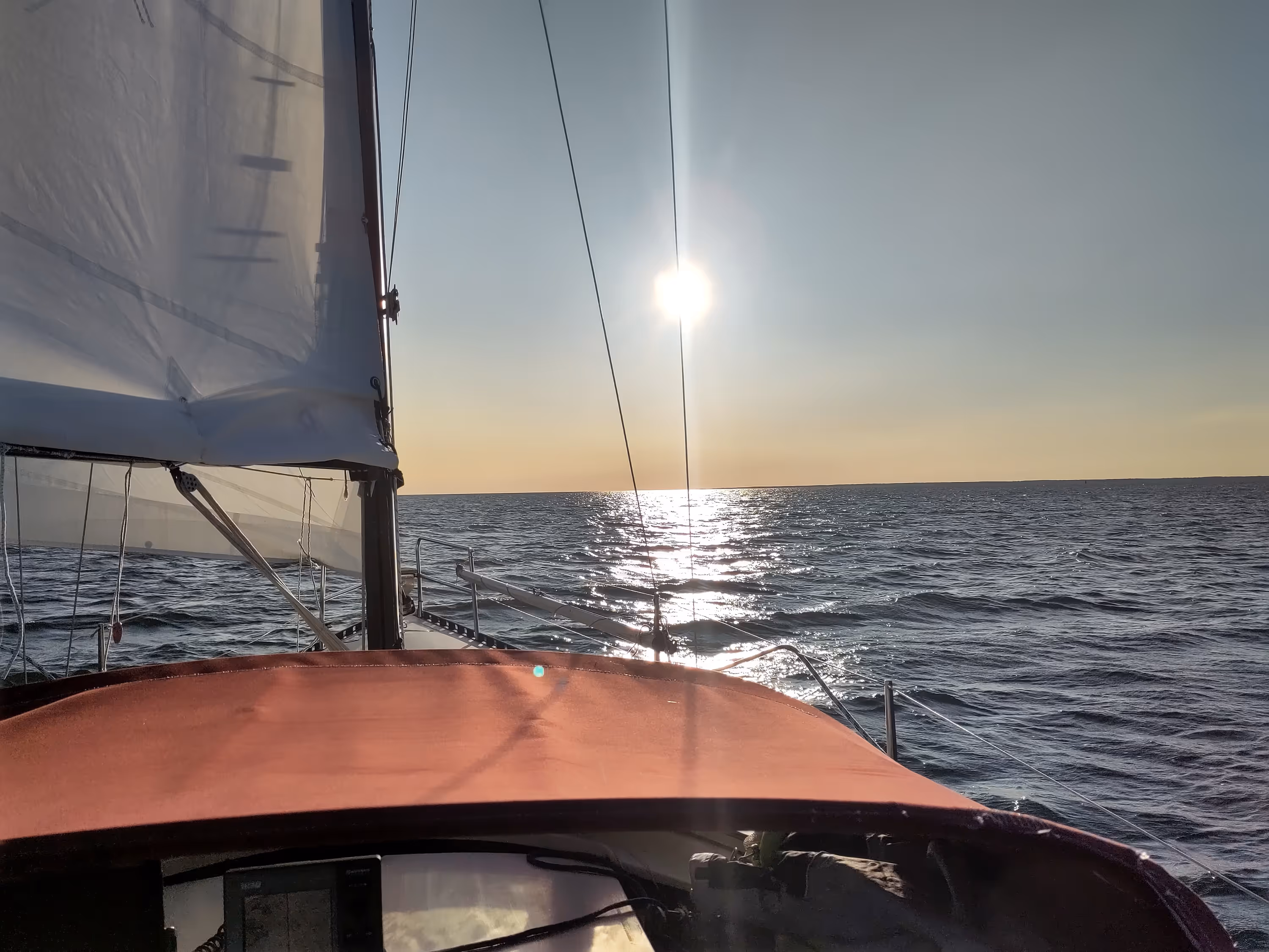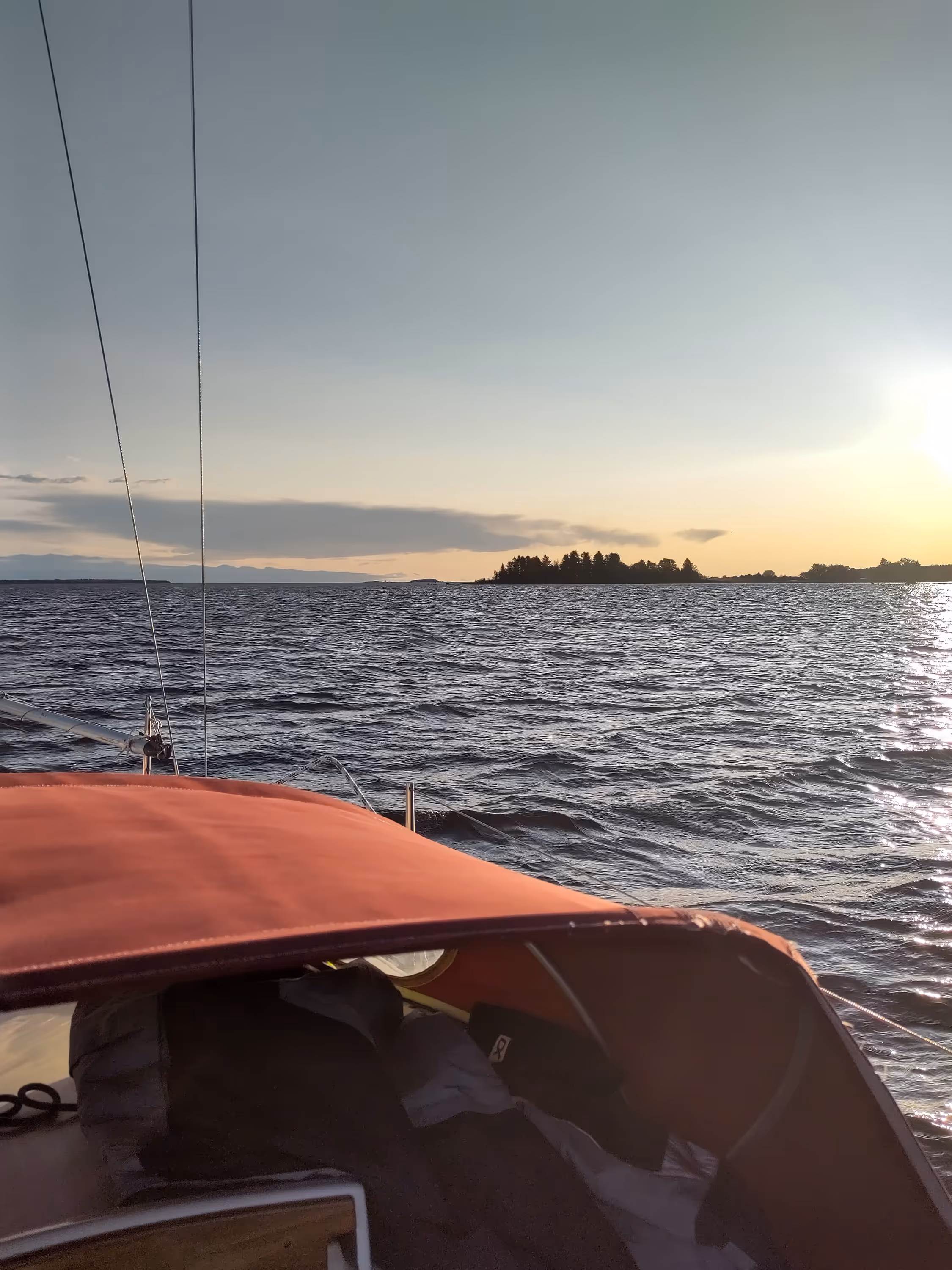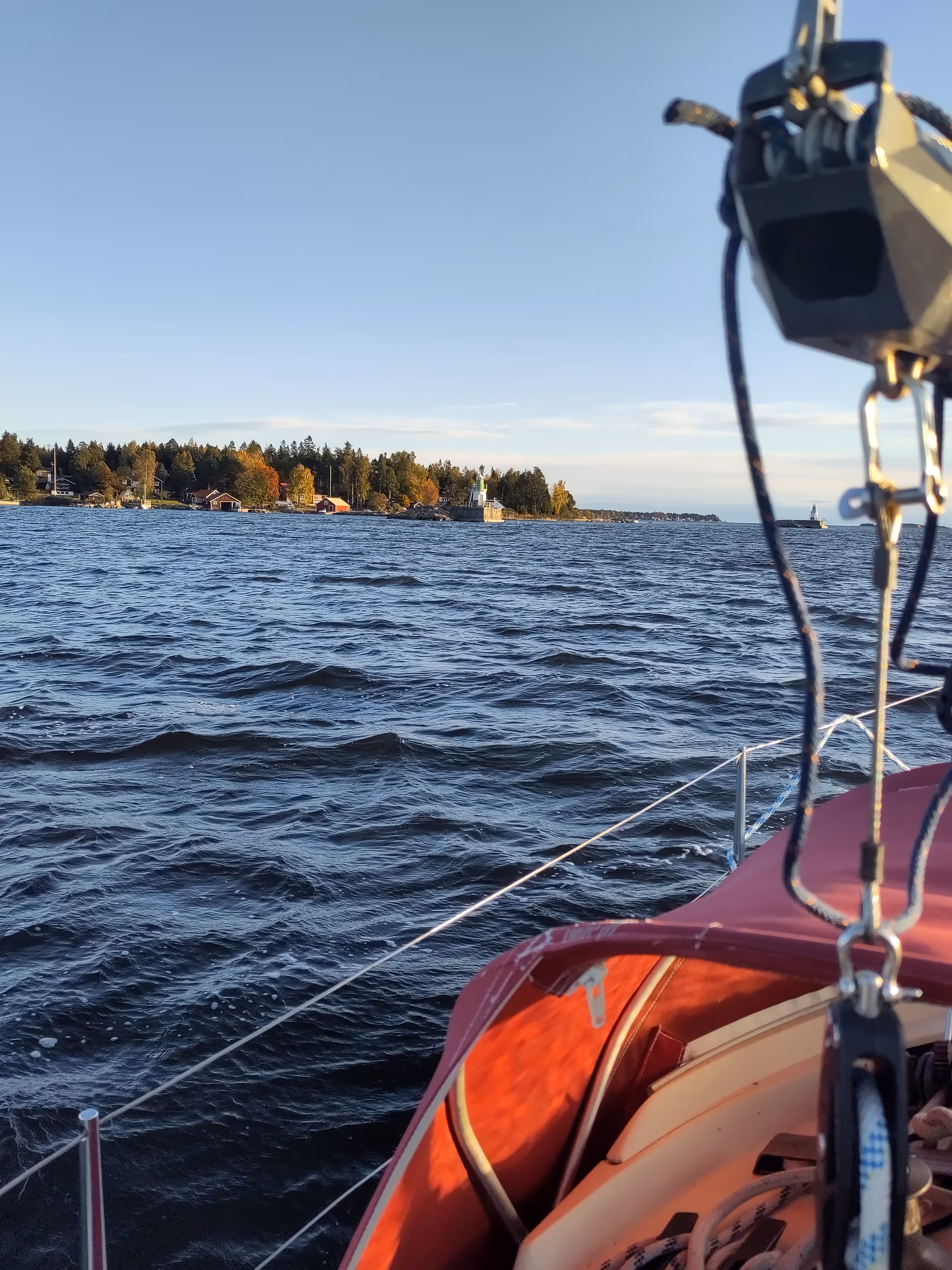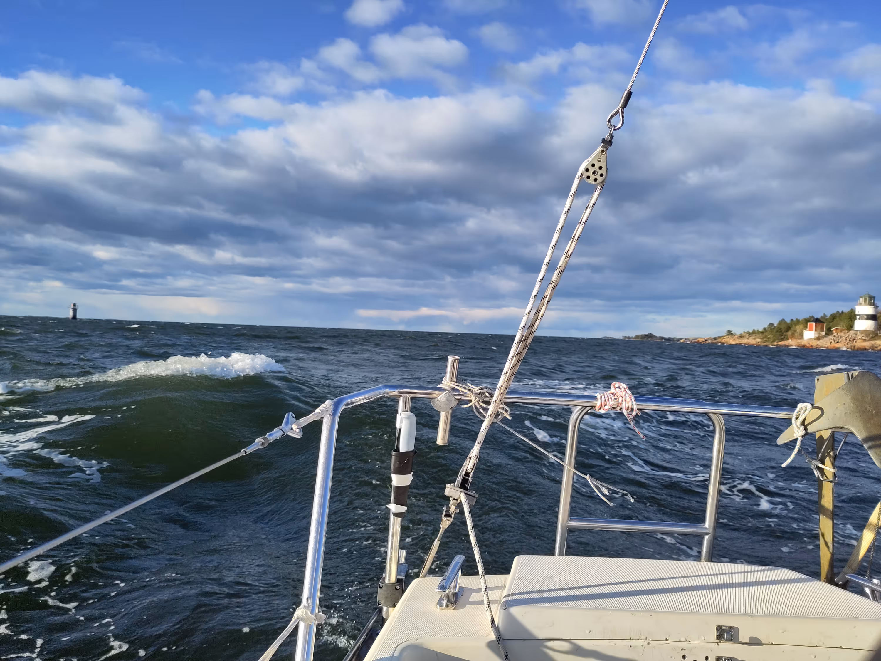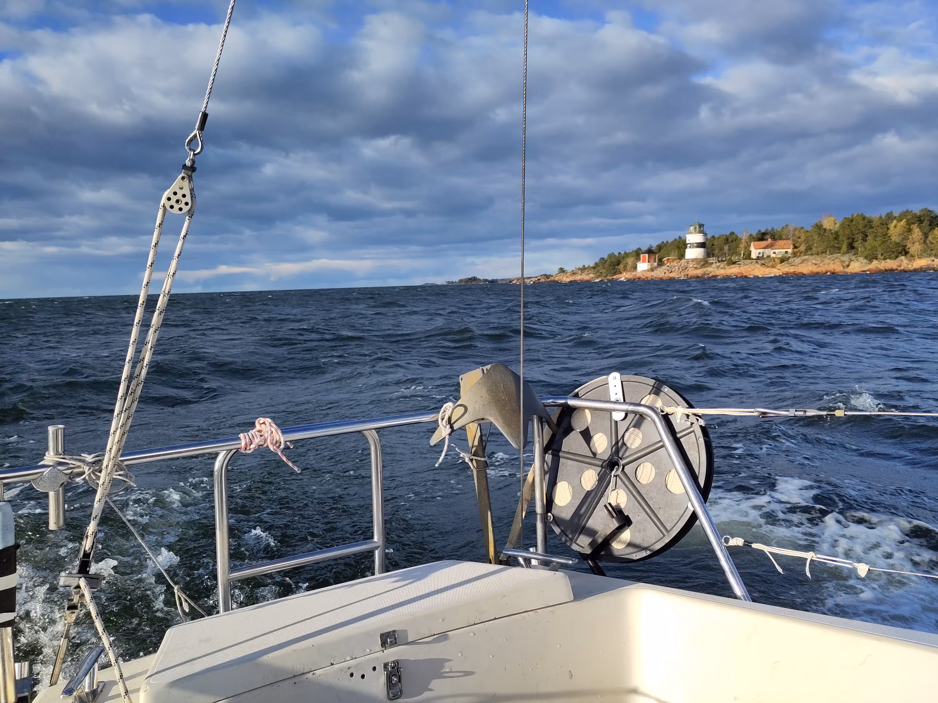 Once I passed the island of Björn and started to turn slightly toward the passage between the mainland and Gräsö, it was a different story. By then the sea had properly formed, and the wind had also grown again. So I took a second reef on the mainsail, reduced the geona to a third of its surface and went on. Even faster! At some point I managed to keep a couple of surf for some 10+ seconds and reached 11-12 kts!