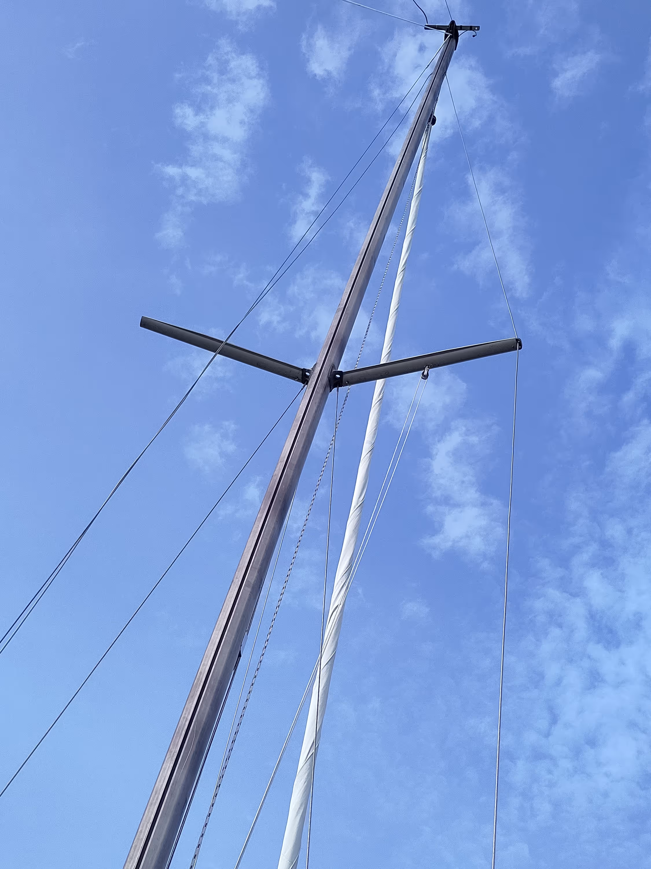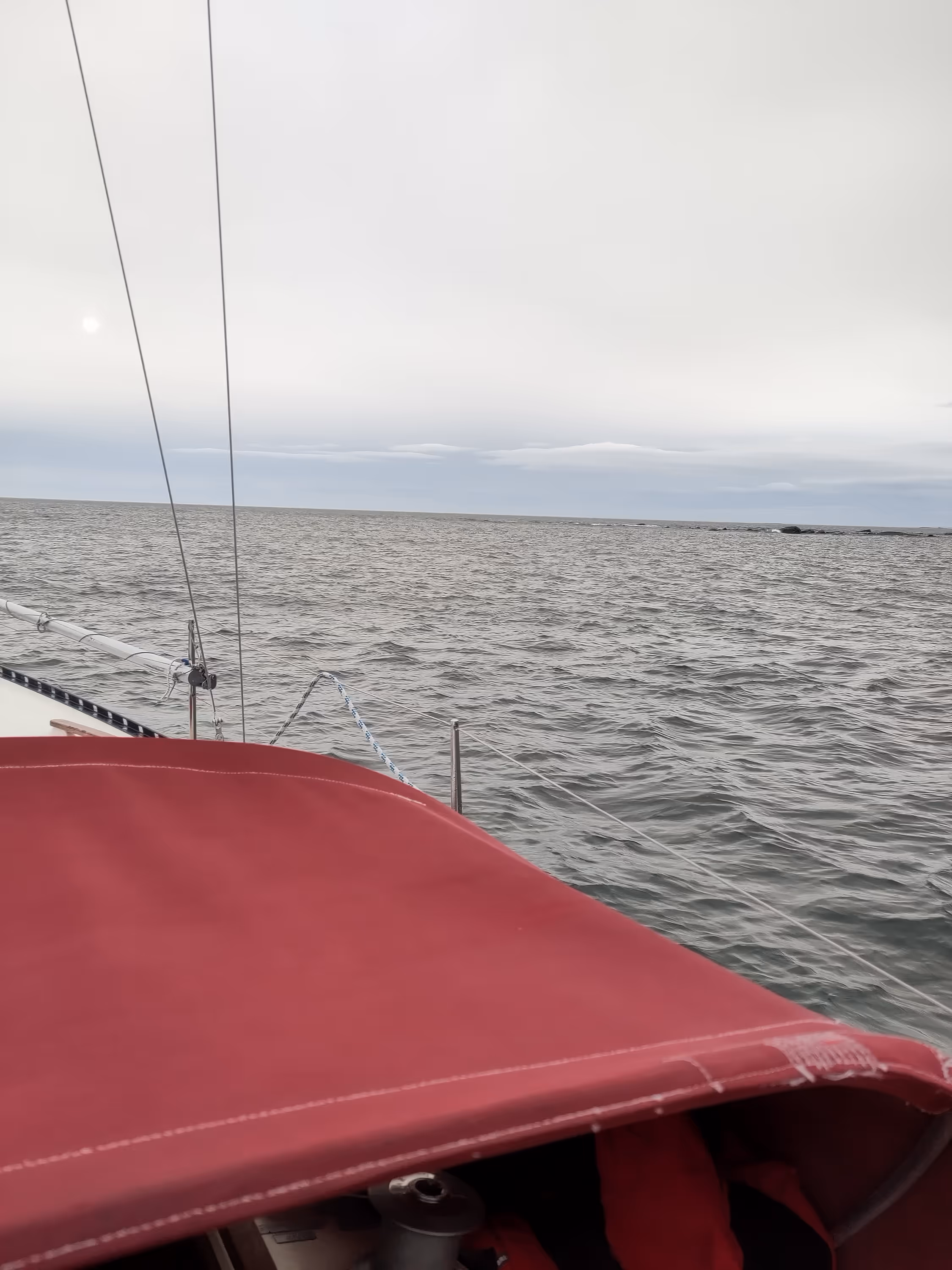 Well, after a nice start, the day as far as sailing is concerned came to an abrupt end when after tacking to port, I saw something strange with the mast. It was bending… After a second of being puzzled, I saw that the shroud was not in the spreader any more… So I quickly took down the sails, started the engine, contacted some seasoned sailors for advice and looked for a place where I could hope for a crane to fix this. Hudiksvall it was, but that was still nearly 19 NM away. Nearly 5 hours of engine later, I managed to reach it and to find a kind person to lift me up with a crane to take the measurements of the broken piece so the Swedish supplier can fix it for me on Monday.