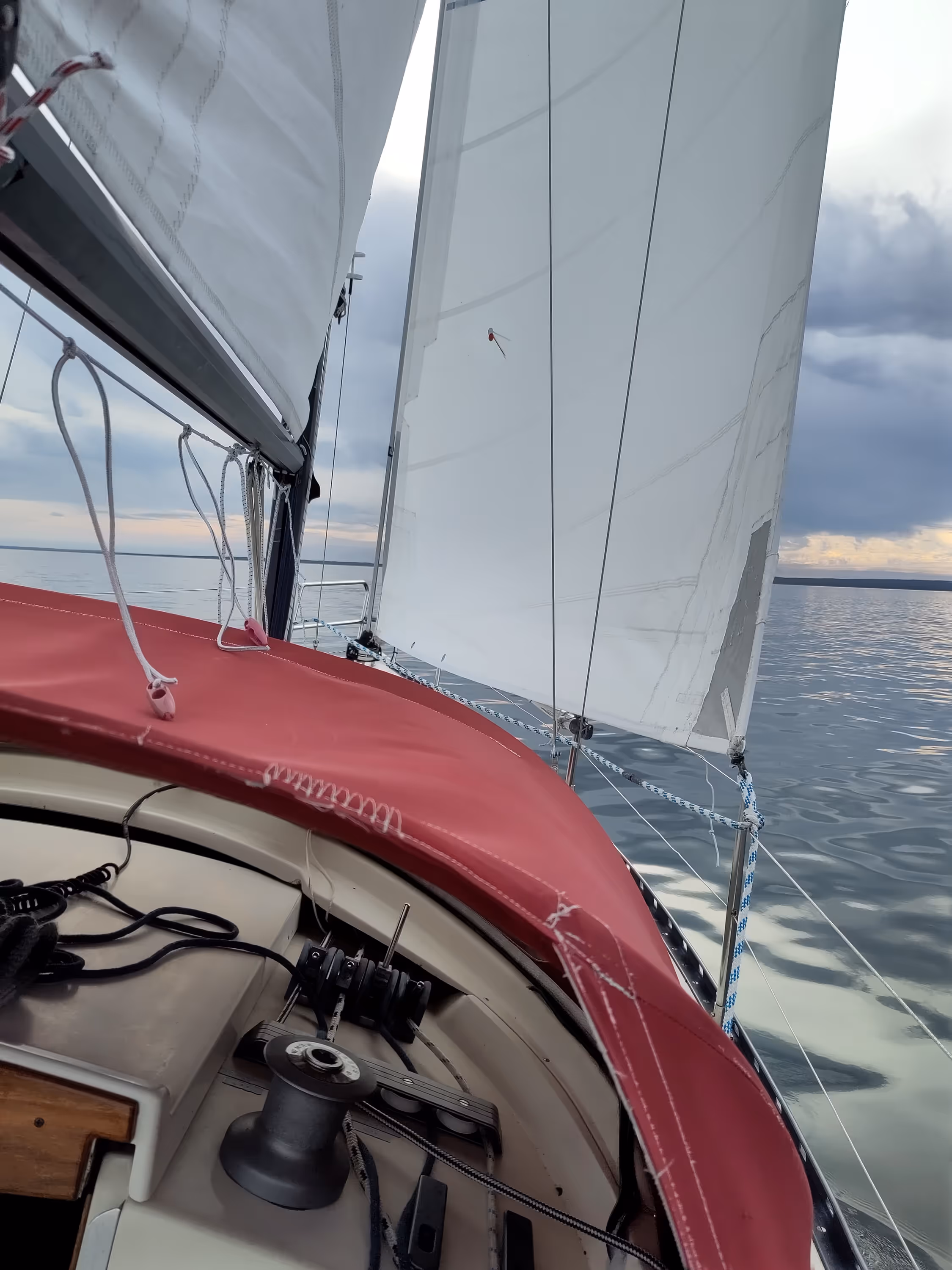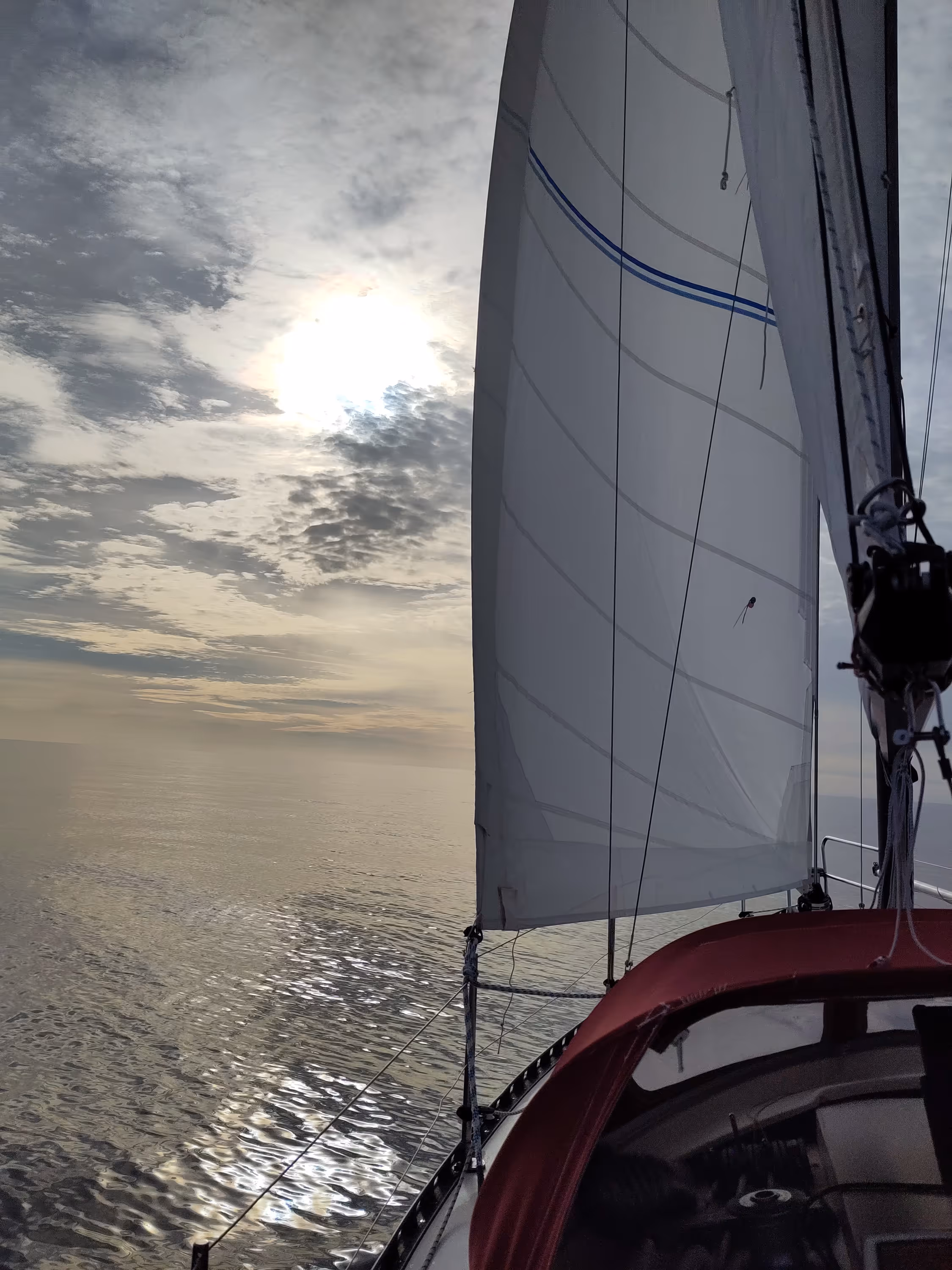 Heavy fog to start the day, so after waking up really early, I had to wait for a bit before I could go. When I did, there wasn't much wind to play with. So it was a bit on and off. I even had to run on the engine for some time because although there was not much wind, there was some stream pushing me toward the shore.