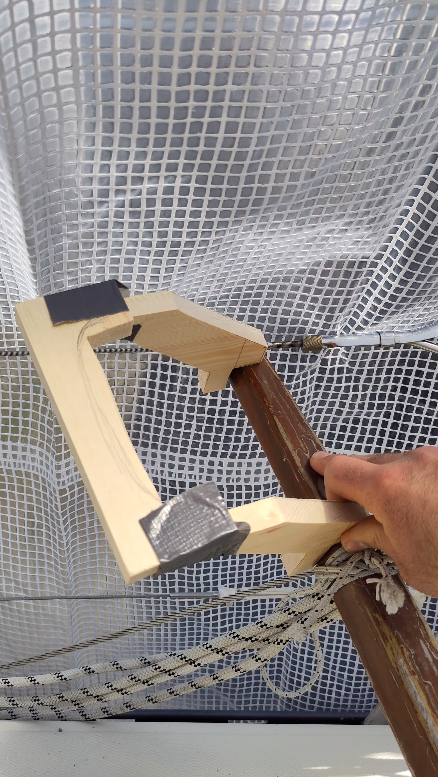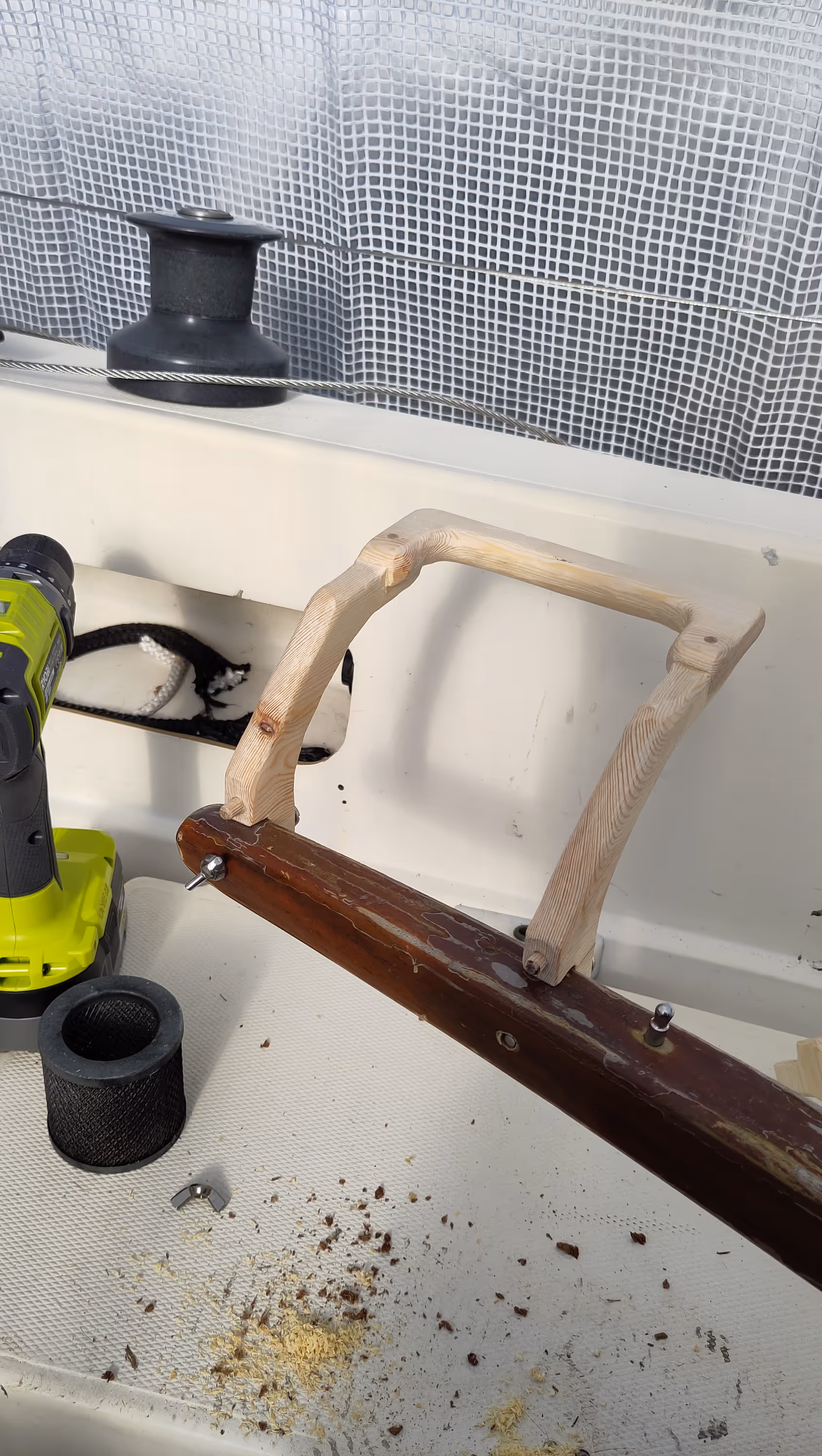 I had to order some parts for the engine maintenance and to replace the anode. It took a long time to arrive. So in the meantime, I got started on some other projects I had in mind for the boat. Building a small support for my clothes to let more air circulate underneath, and a small tiller extension, so I can stand more upright while stirring.
