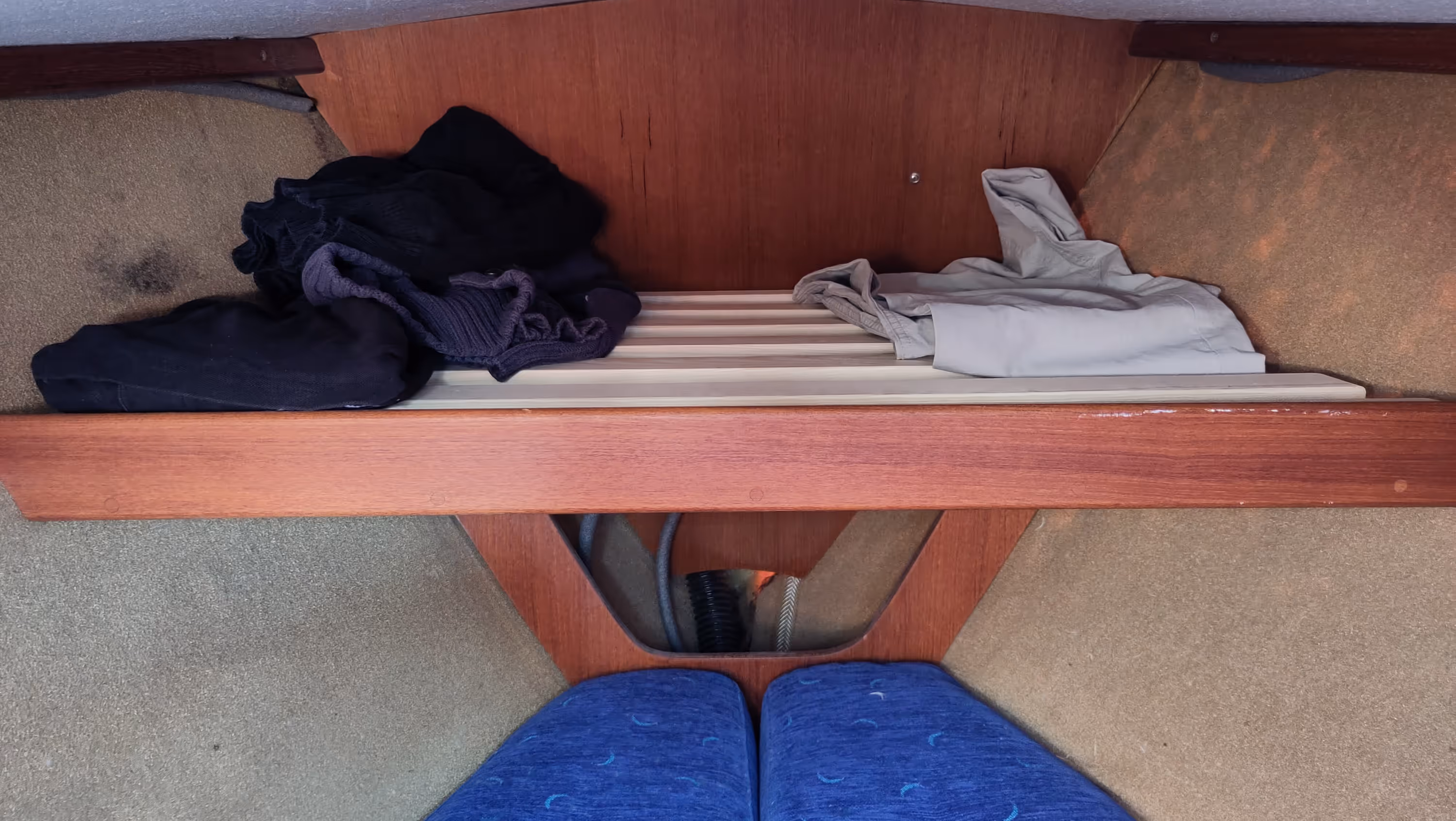 The forepeak storage “support” for my clothes is ready too. I had to wait for the wind to pipe down a bit before putting the mast in place, so it was a good opportunity to wrap up on that stuff.