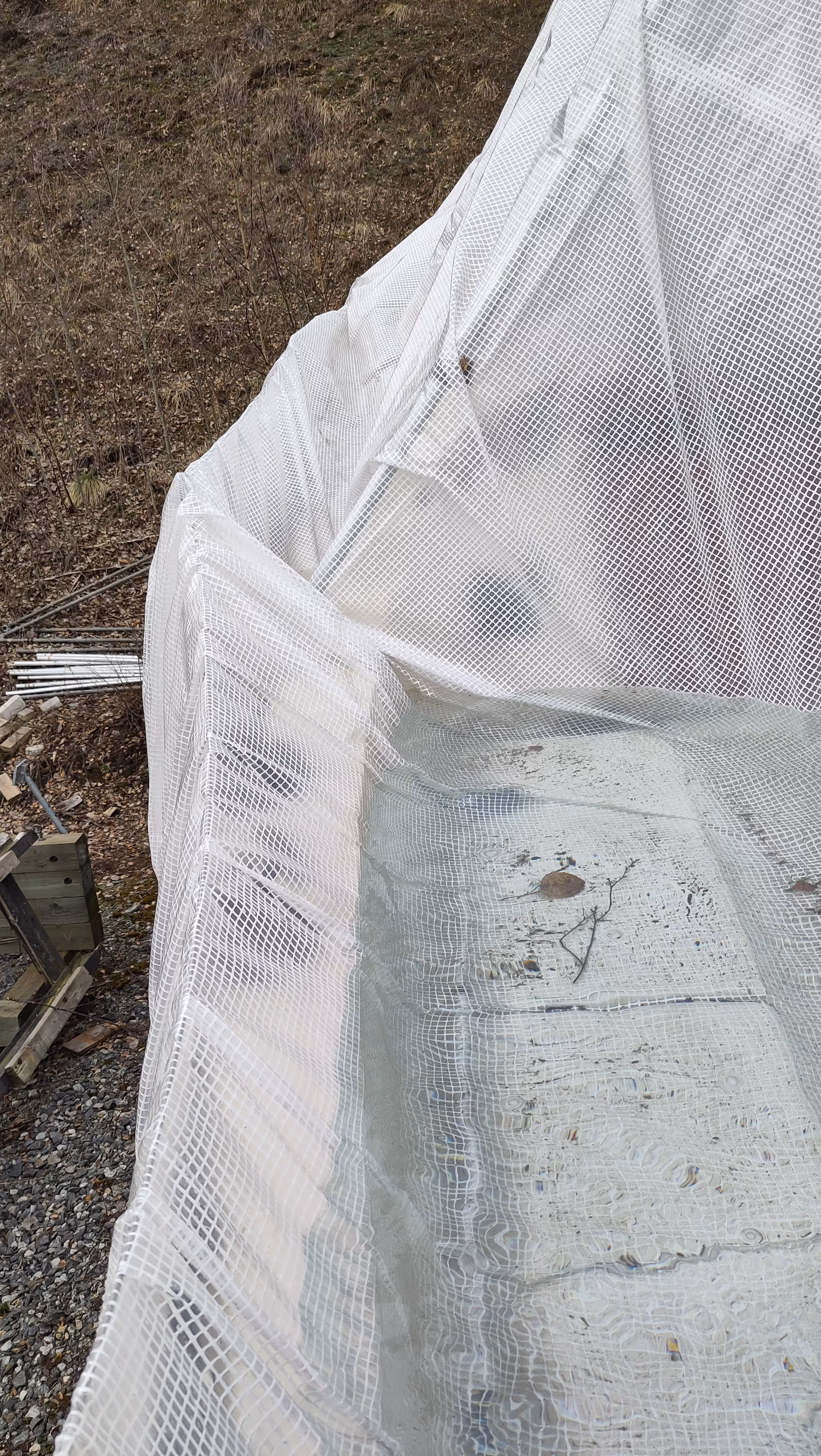 Over all the tarpaulin had hold nicely with the exception of the melting snow forming a big pool on one side.