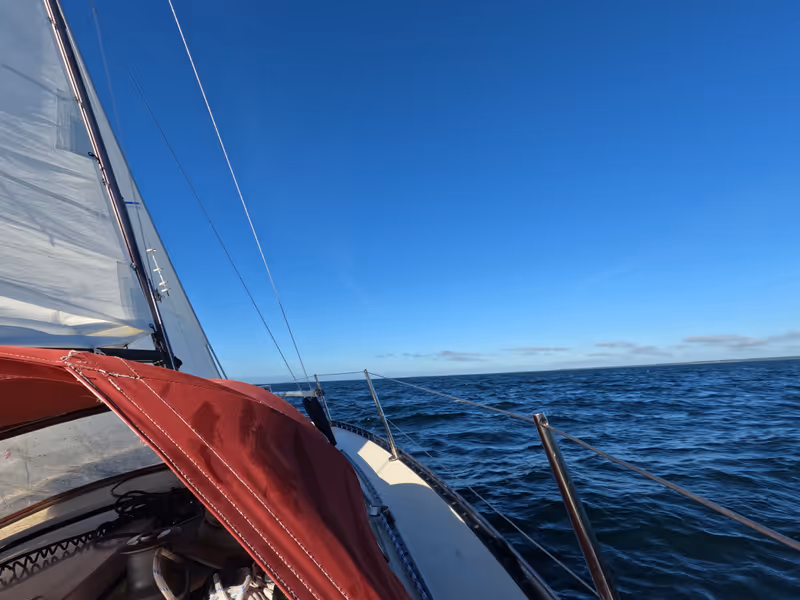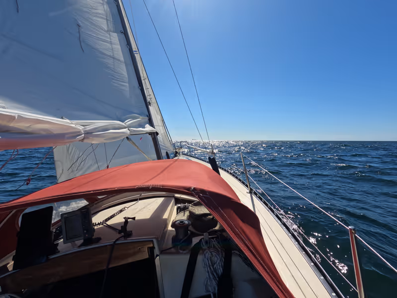 At last! The forecast looks decent, so I got up early, took some time (too much time) to get ready, and I left the harbour around 6:30 without a breakfast, sails up before 7 though! And then let's go for 12+ hours of sailing! The entire day on the same tack, minimal course adjustment and minimal sail trimming. Well, I had to take and shake reefs a few times.