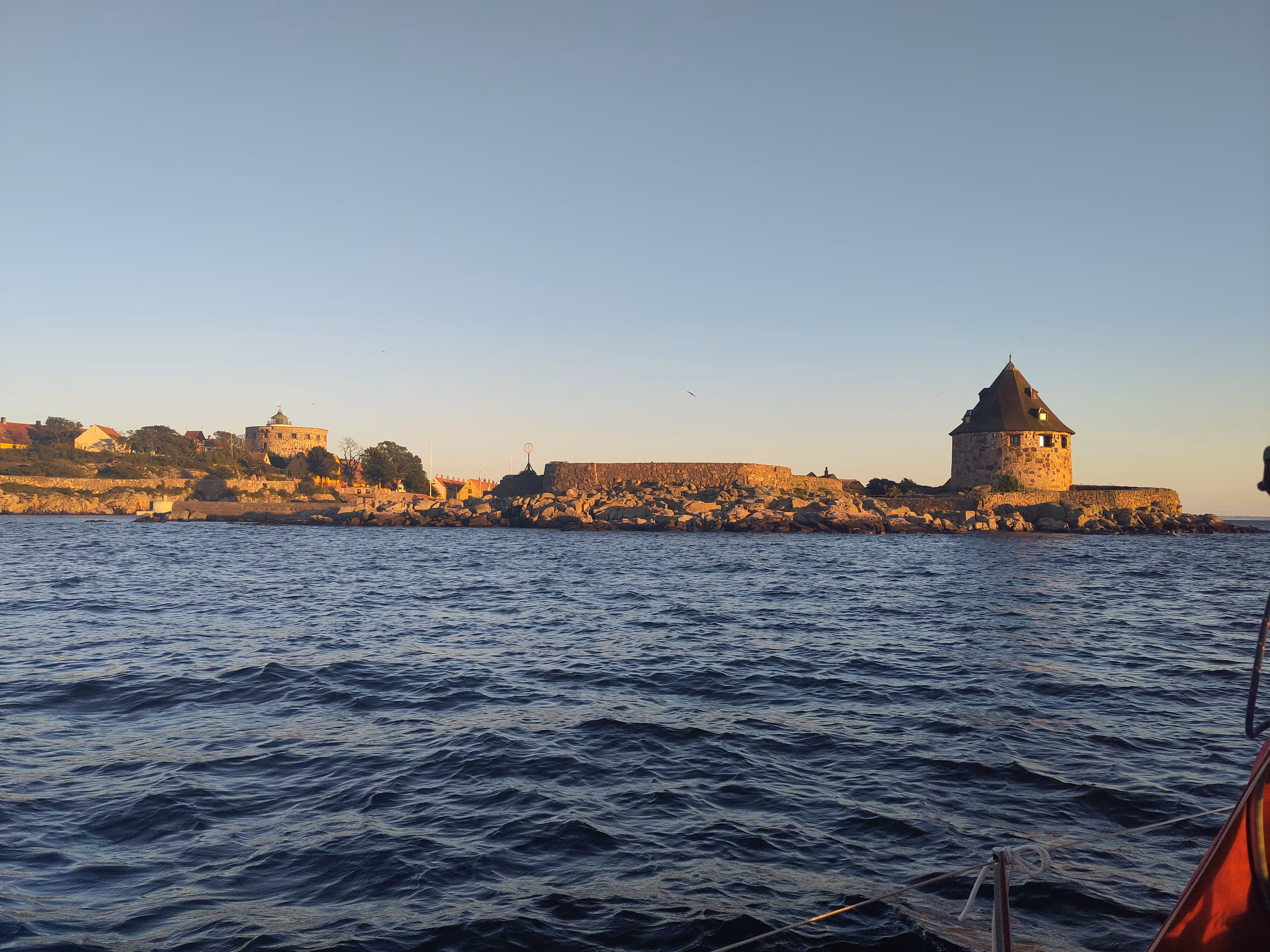 When Christiansø was on sight, the wind started to decrease a bit. And just before that, I contrive to stumble in the cockpit and smash my hand-made handle to pieces… anyhow, I'll re-glue it together. I tried to approach from the north side but, thankfully, I also thought I'd call them to have a better idea of where I should go and learned that I should actually go on the south side. By then I had already taken in the sails, so I made a little tour around the island on the engine, which was quite nice in the end.