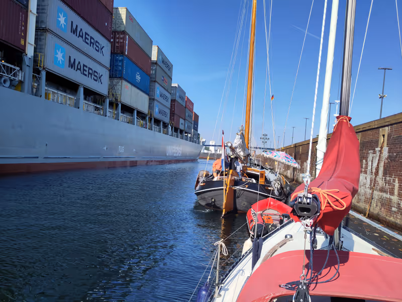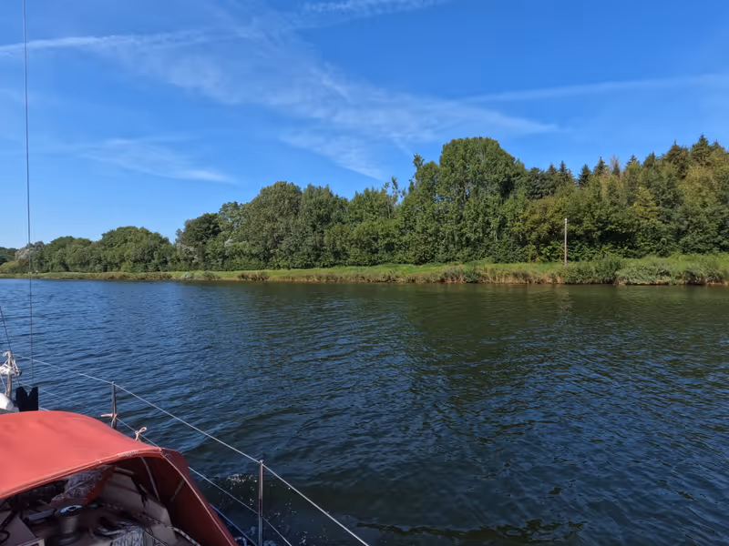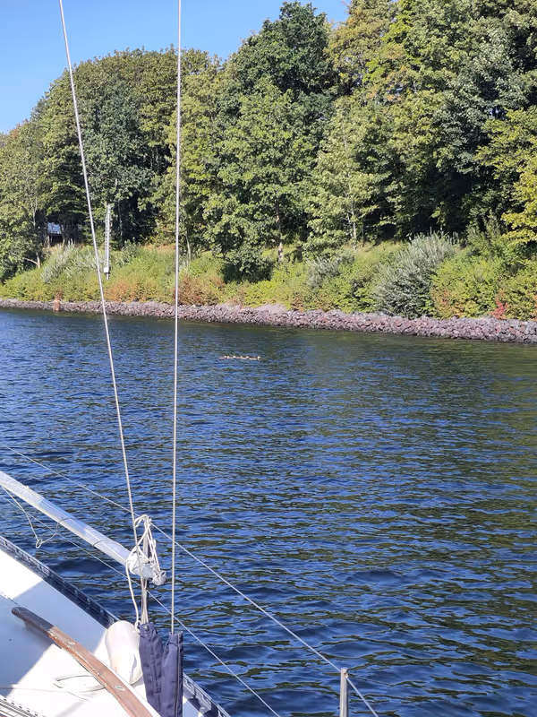 I left Laboe around 8, arrived in front of the lock around 8:40, waited around just a few minutes before hearing the call on the VHF that it was time for leisure boats to get in. As I was rushing in behind the 3–4 others like me, I heard the bell indicating that the lock's door was going to close. Thankfully, I was through before it started to move properly, but that was a bit of an adrenaline rush I would have done without.