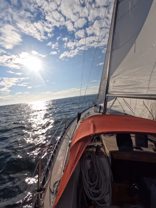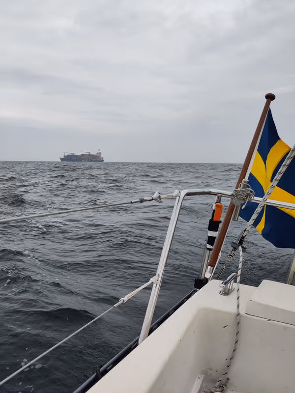 I had a lot of fun smoking another sailboat by sailing faster and more upwind and letting them far back under my lee. Fair enough, usually I'm the slow one, so it's good to enjoy the reverse every now and then. The long part to get to the Swedish shore crossed a shipping lane. I had no problem passing the first half (where boats go from south to north) but when approaching the other part (north to south), a rather big container (well, at least it felt big to me) was a bit too close to crossing path with me. I tacked and ran closed-haul on the starboard side long enough for it to pass me, and then finished crossing the shipping lane in peace.