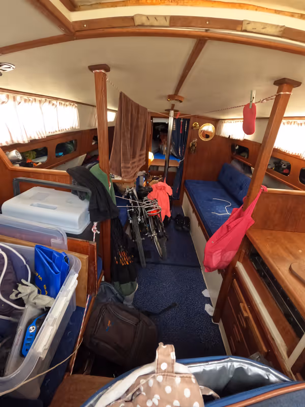 I originally had the bike on the deck, but after it got entangled in the genoa sheet, I've put it in the hold/cabin.