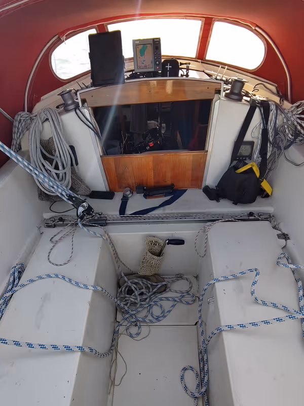 The exit of the Borgholm harbour was not the easiest, there was quite a bit of side wind to leave the channel, but once I could hoist up the sails and start to go downwind towards Kalmar that all went rather easy. But the fresh wind didn't last that long and quickly went down to a slowish pace. That gave me time to do a bit of crocheting and to make a small pocket for the winch in a place that is more convenient than in the big one I had made last year.