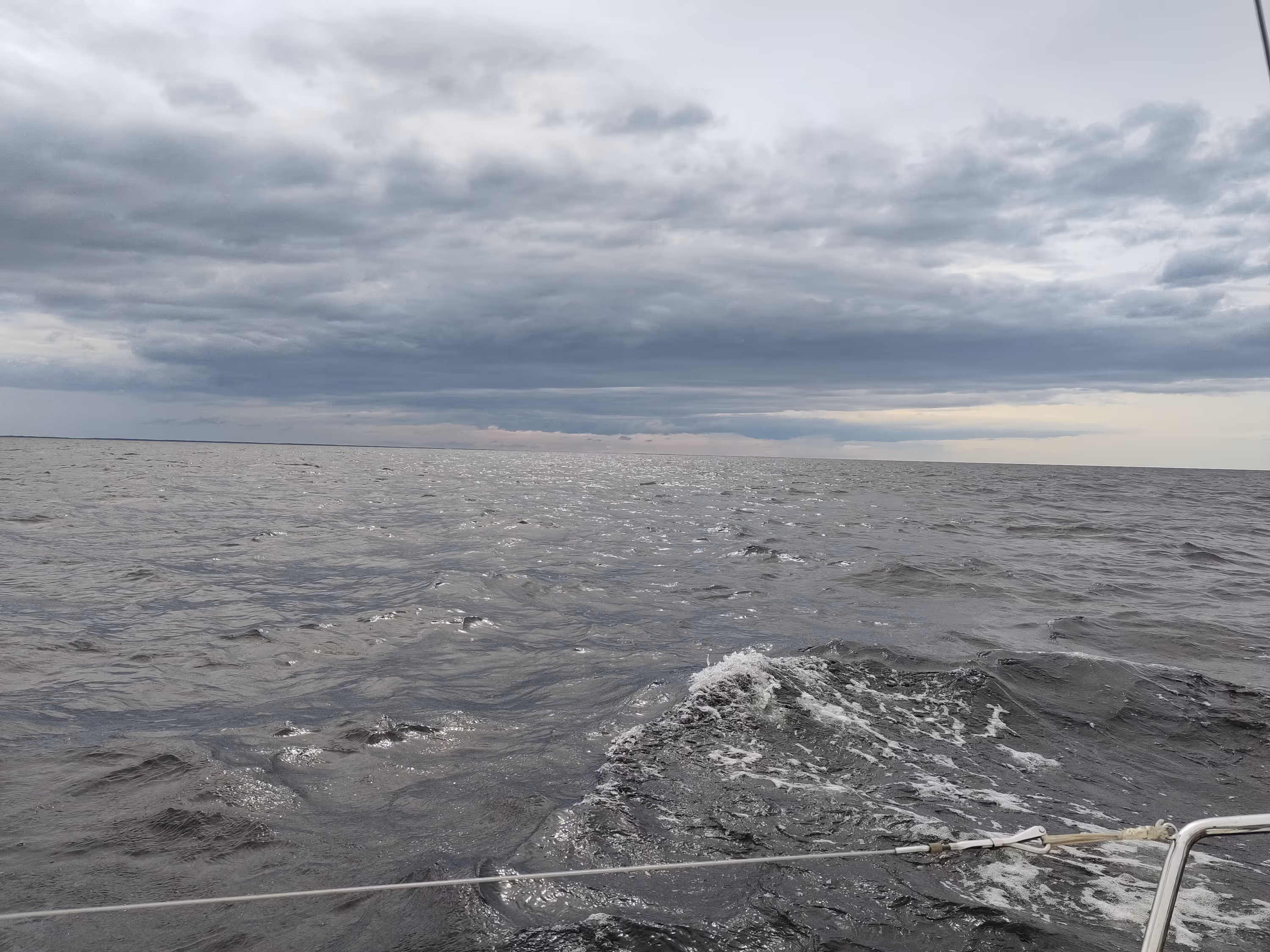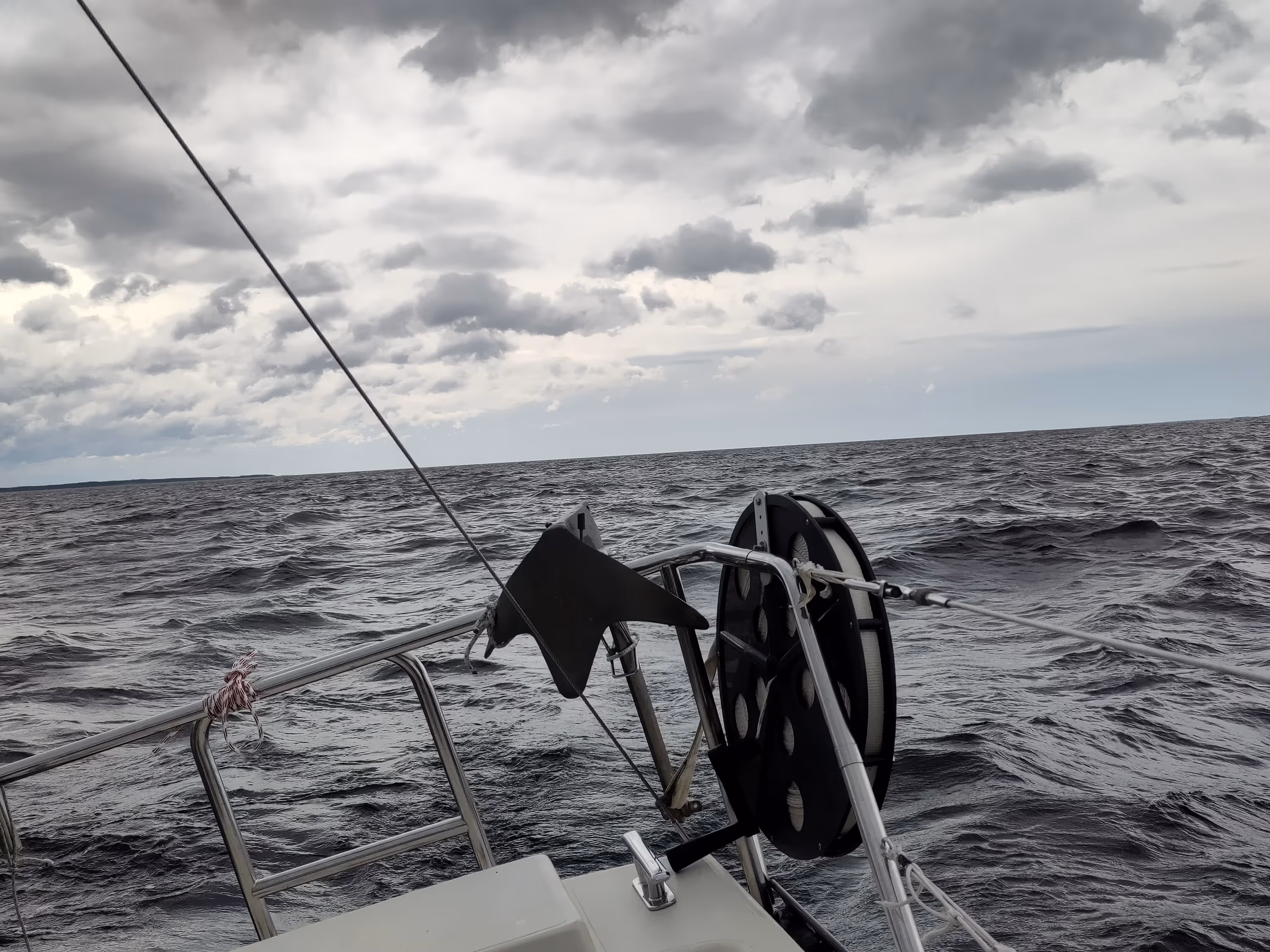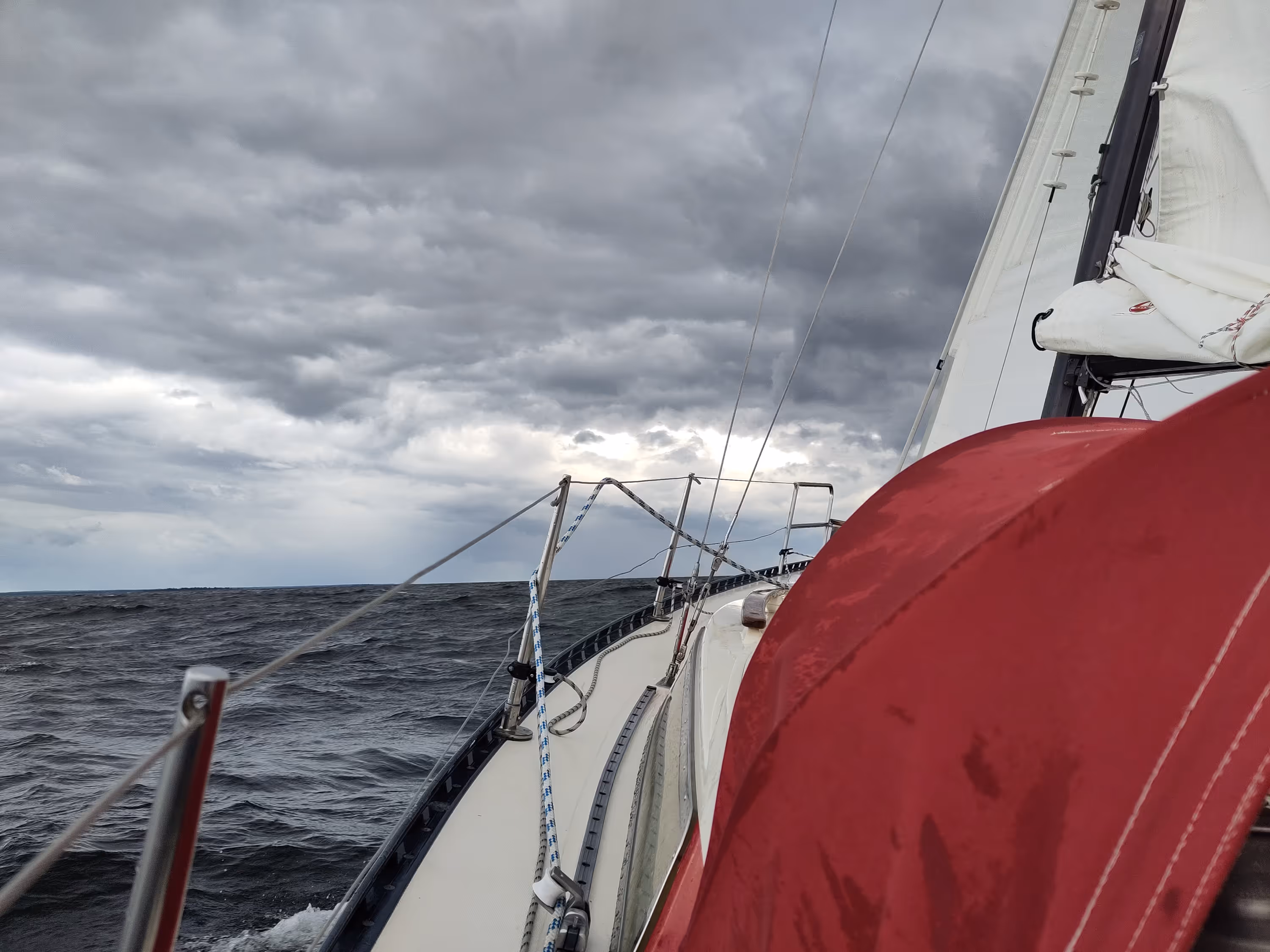 At 8am, I pulled up the anchor and got under way without even starting the engine. The wind was strong but not so much, it grew up however and from 9 to 11:00 I could sail at a good pace and make good progress. After that, the sea and the wind picked up to the point where I chose to take a reef. The pace was unimpaired by the reduction of the sail surface (well after the back and forth between the mast and the cockpit to take in the reef). At 12:30, the wind gusts were even stronger, and I took in a second reef, again, with the increased wind I barely lost any speed. All the while, there was the occasional rain to keep me company, but the spray projected by the waves on Elvira's hull had already socked my sail clothes.