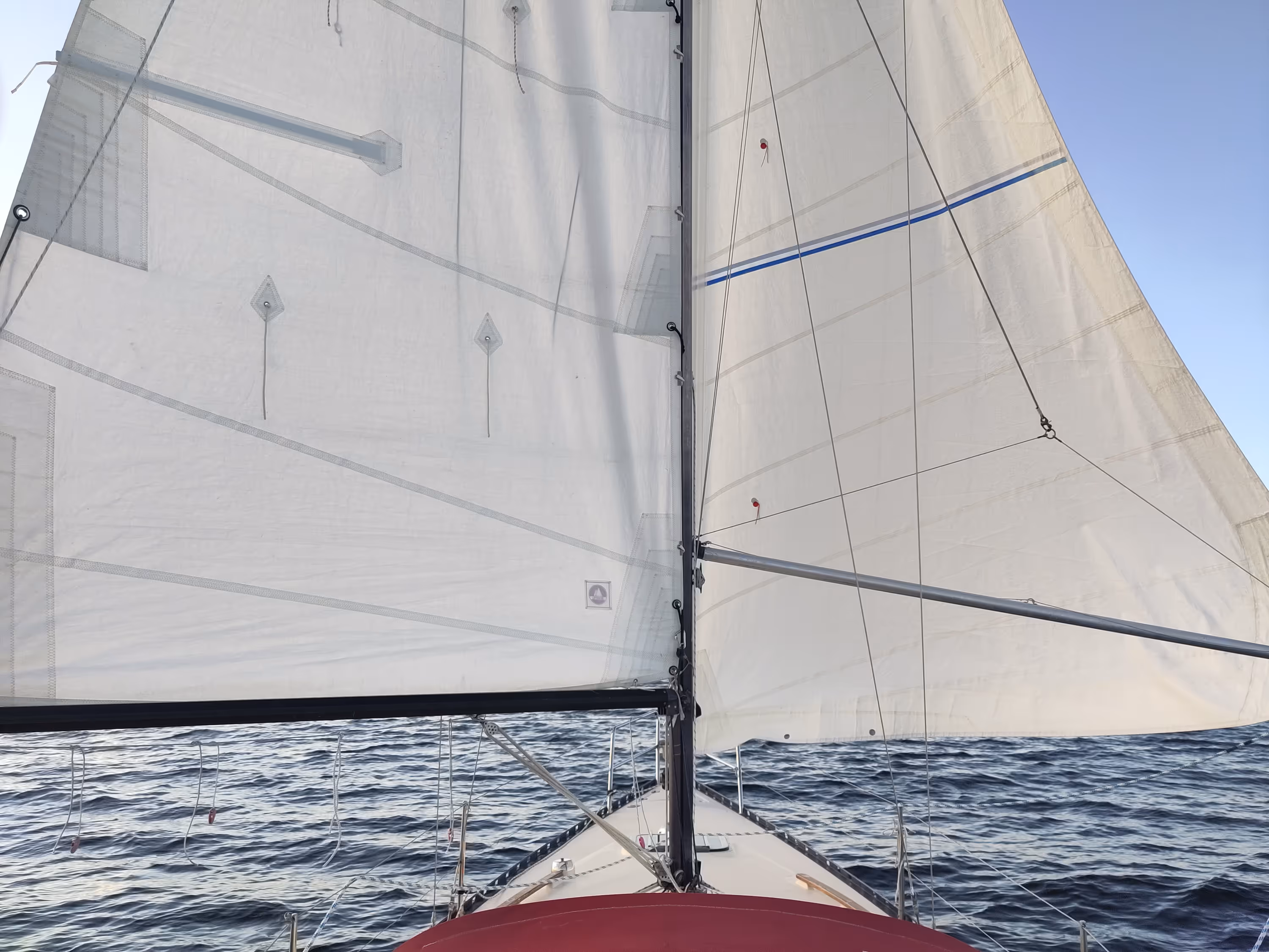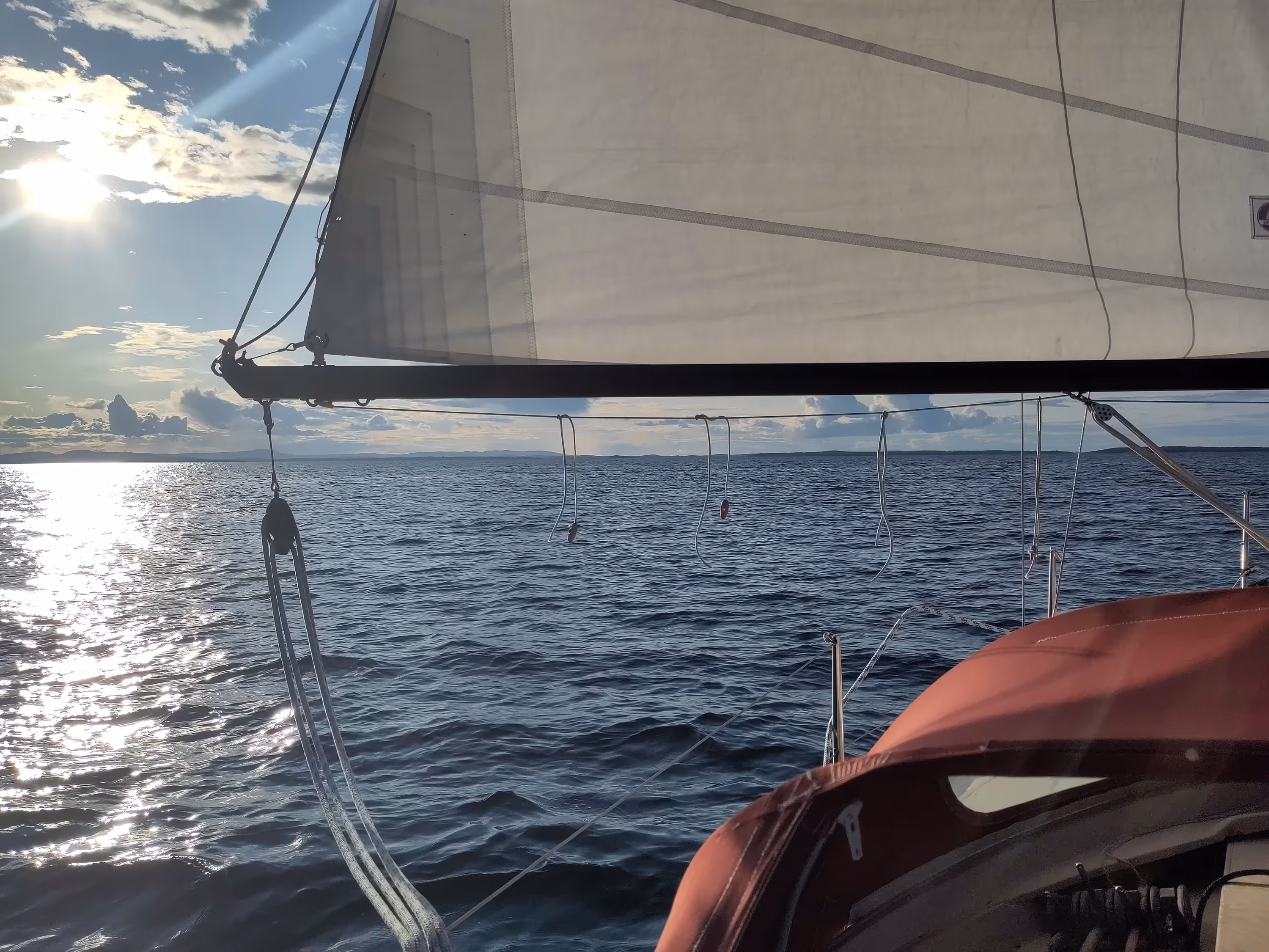 Still on the sea, but I'll start writing now. I'm making barely 2.6 kts at the moment on a completely flat sea. The day started quite OK. Not much wind again but some, I could glide between islands easily. Then around 2pm, the breath that was supposed to last me the entire day came, helped me get moving just fine and then left me there in the middle of nowhere on a sea that was as calm as could be. There was so little air that the genoa wouldn't even move no matter how much angle I would put with the wind. I decided this was the perfect time to try setting up the spi pole on the genoa and just run from the wind to my evening spot. According to the GPS, I've one more hour of slow glide before taking in the sails and motoring my way to tonight's mooring. I hope there will be a buoy free, if not there is another spot just nearby that one. Between the two, I hope at least one buoy will be available for the night.