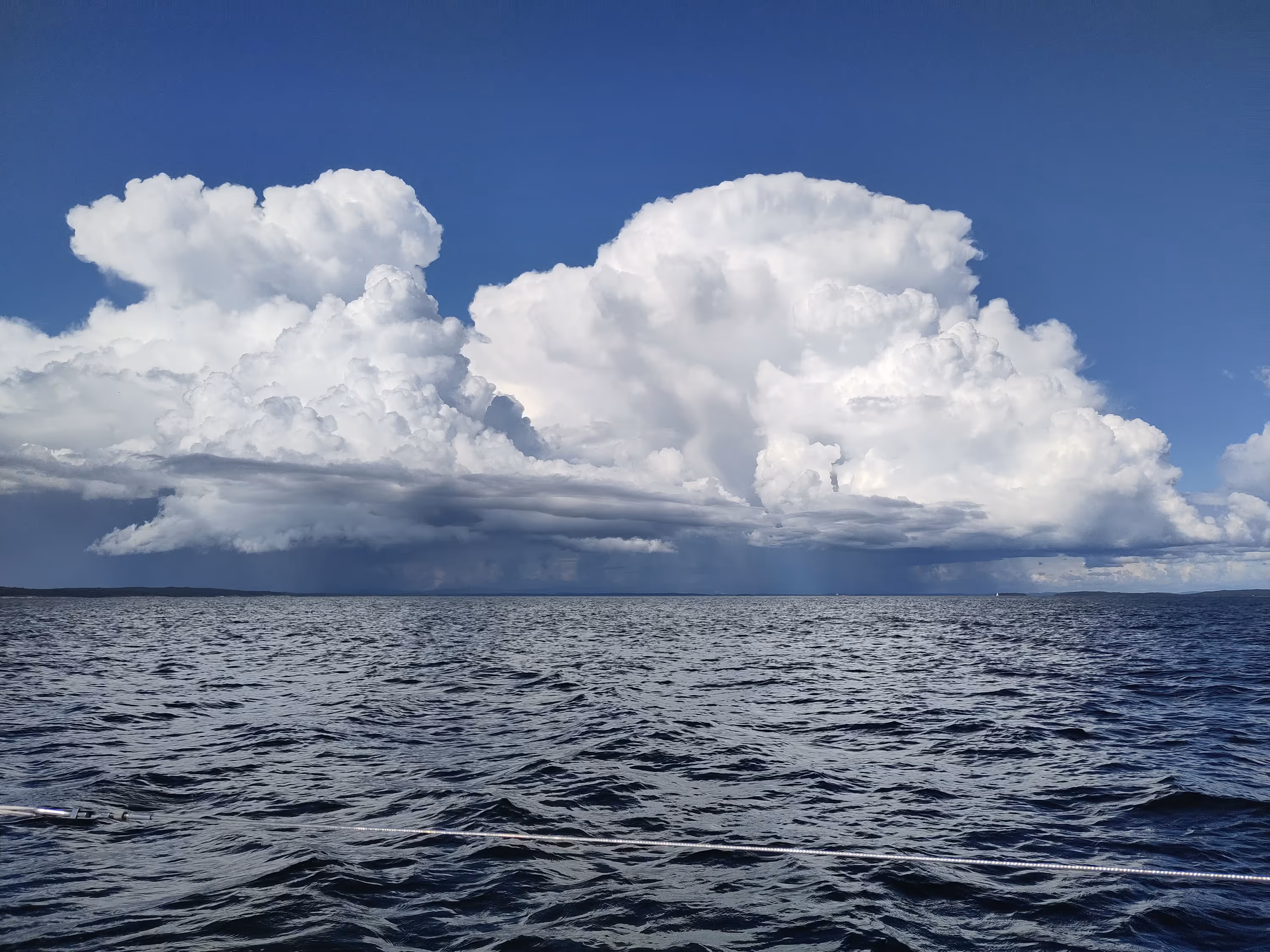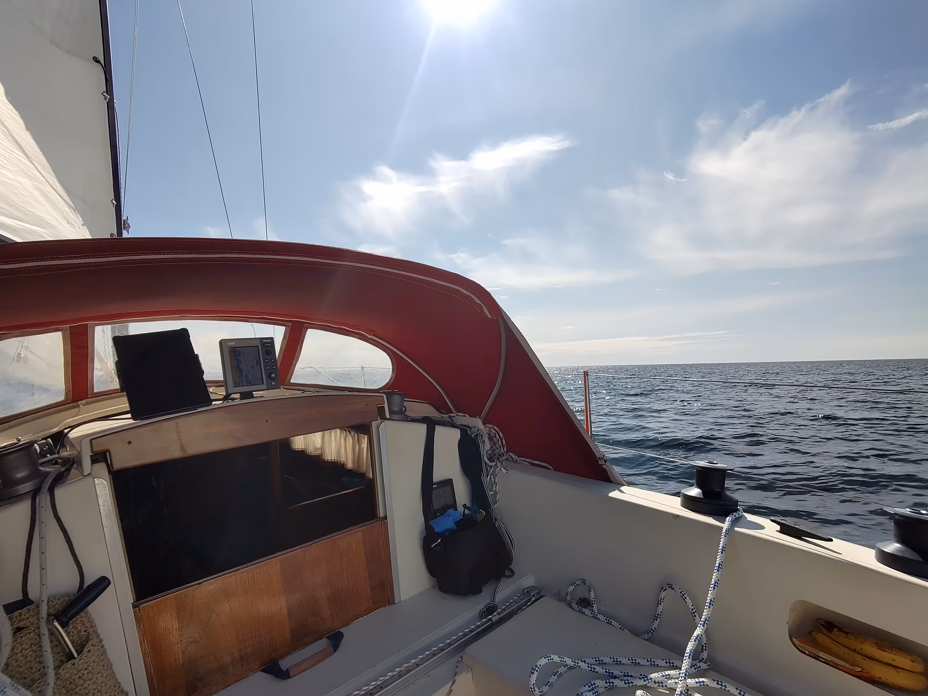The first calm happened around 1pm, and fortunately it didn't last long, it was pretty uncomfortable to stay windless in these waves. When the wind picked up again, it came 180° from where it previously was, which means that for a while I was able to surf while going against the wind with Elvira. But all good things must end. As a short sea gradually came from one direction, while the longer one still lingered on the opposite side, the wind disappeared entirely, letting me in an even more uncomfortable sea, with the sails flapping about in all directions.