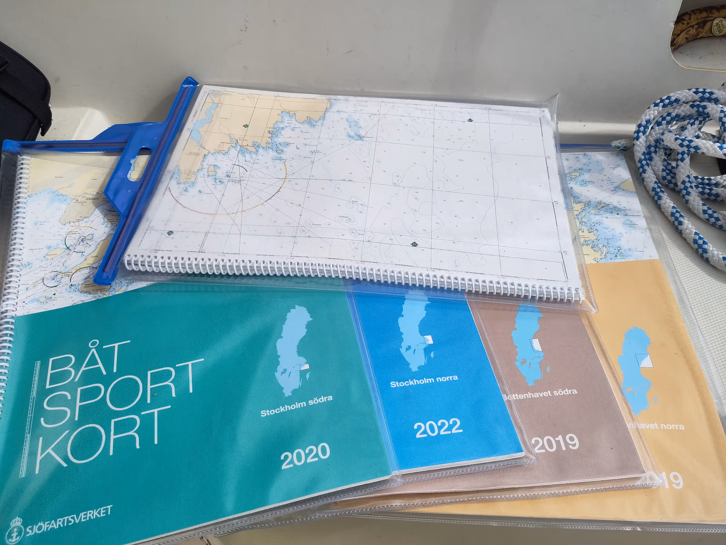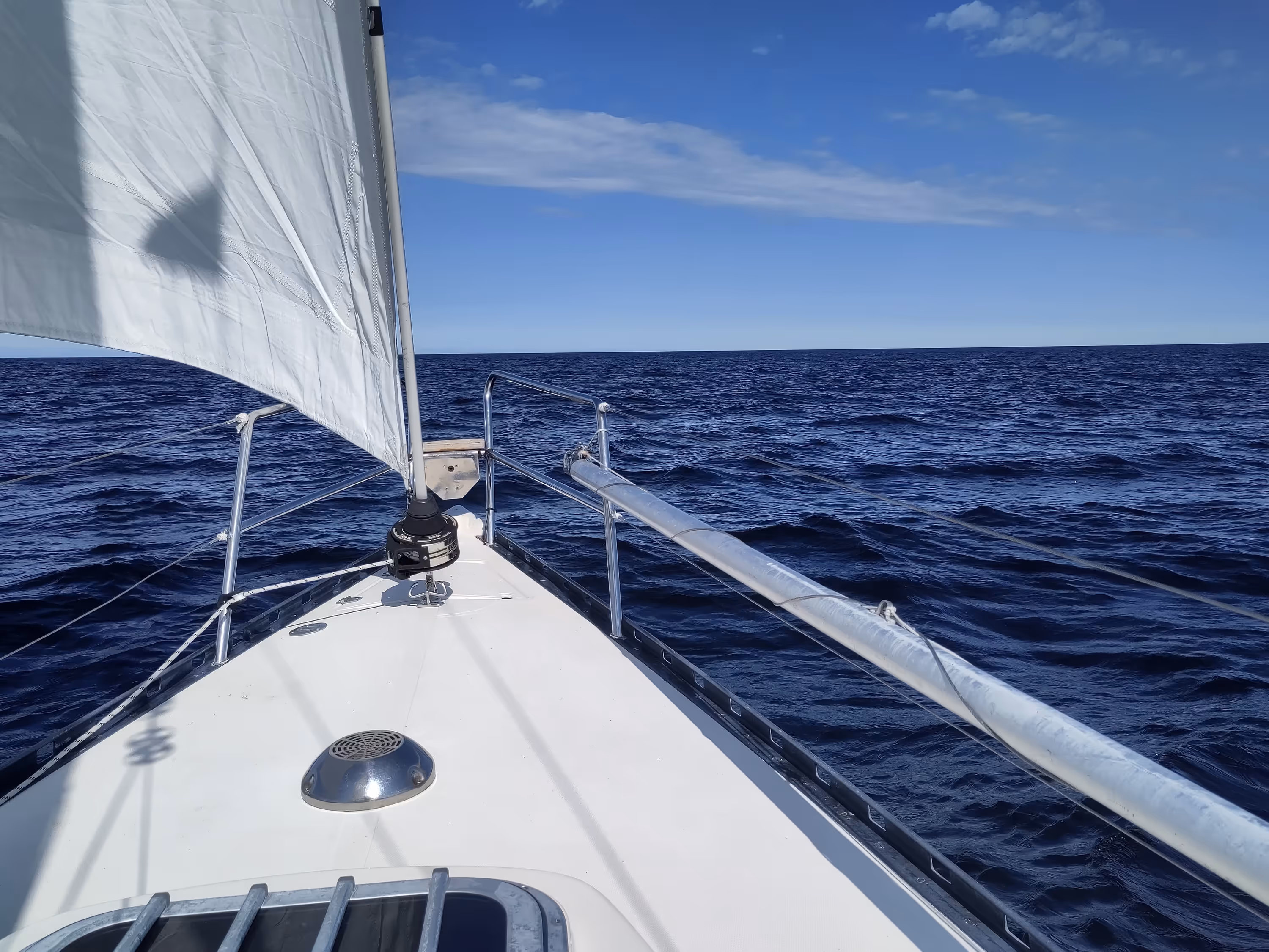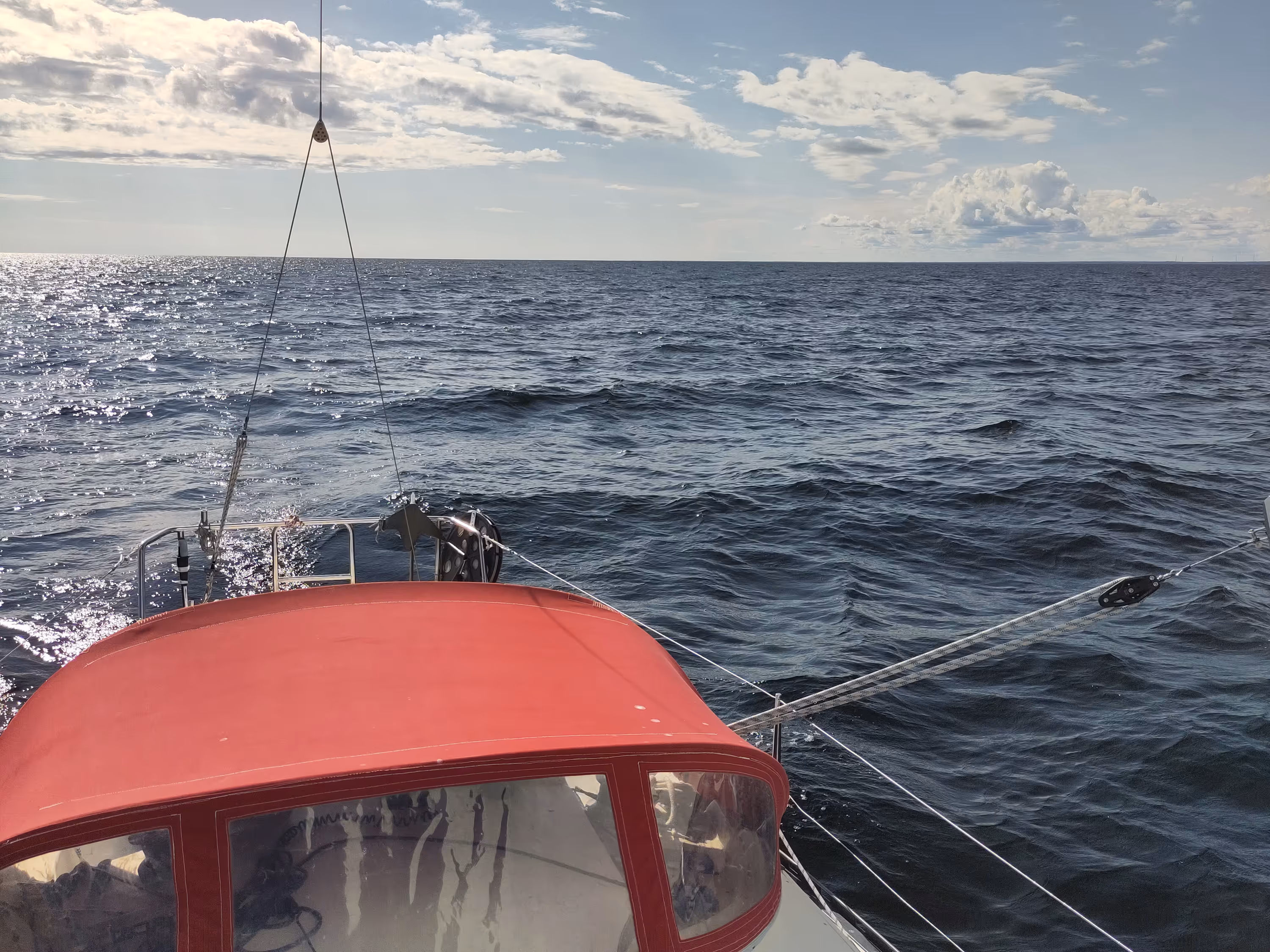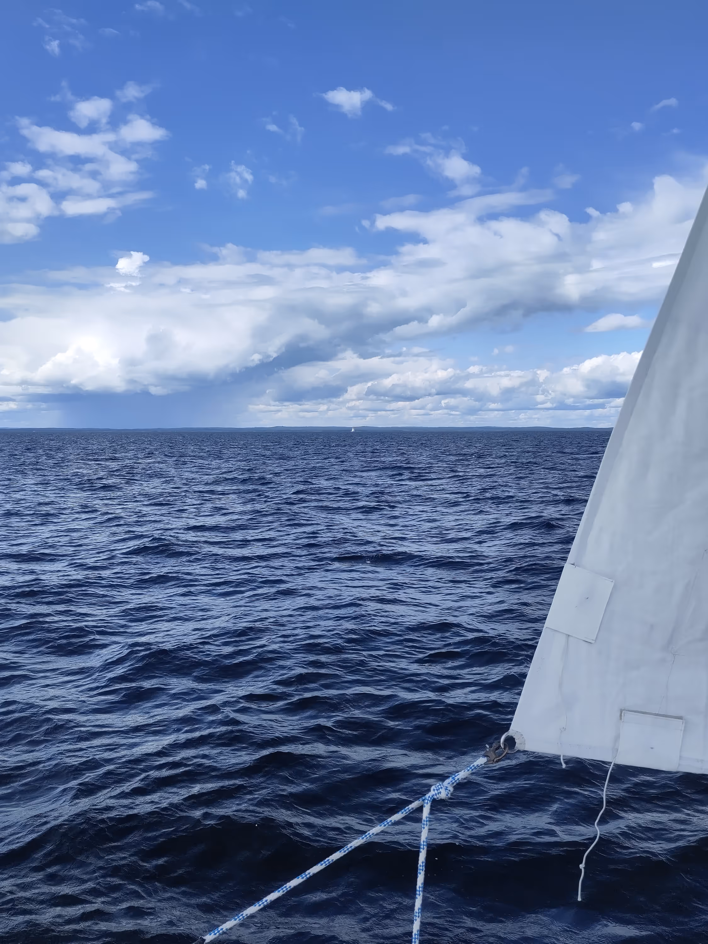 After a few manoeuvres to get going, I hoped to not make as much cap towards my destination as I could. Instead, I opted for a slanted approach which meant longer distance but hopefully at a higher pace making up for it. It's hard to tell if that was the right choice seeing as there are really few sailboats on the sea. The only one I can see now looks like one of the modern cruisers (that was also at the dock yesterday) which has much more sail area. It is gaining slowly on me, but not more than could be expected, I guess.