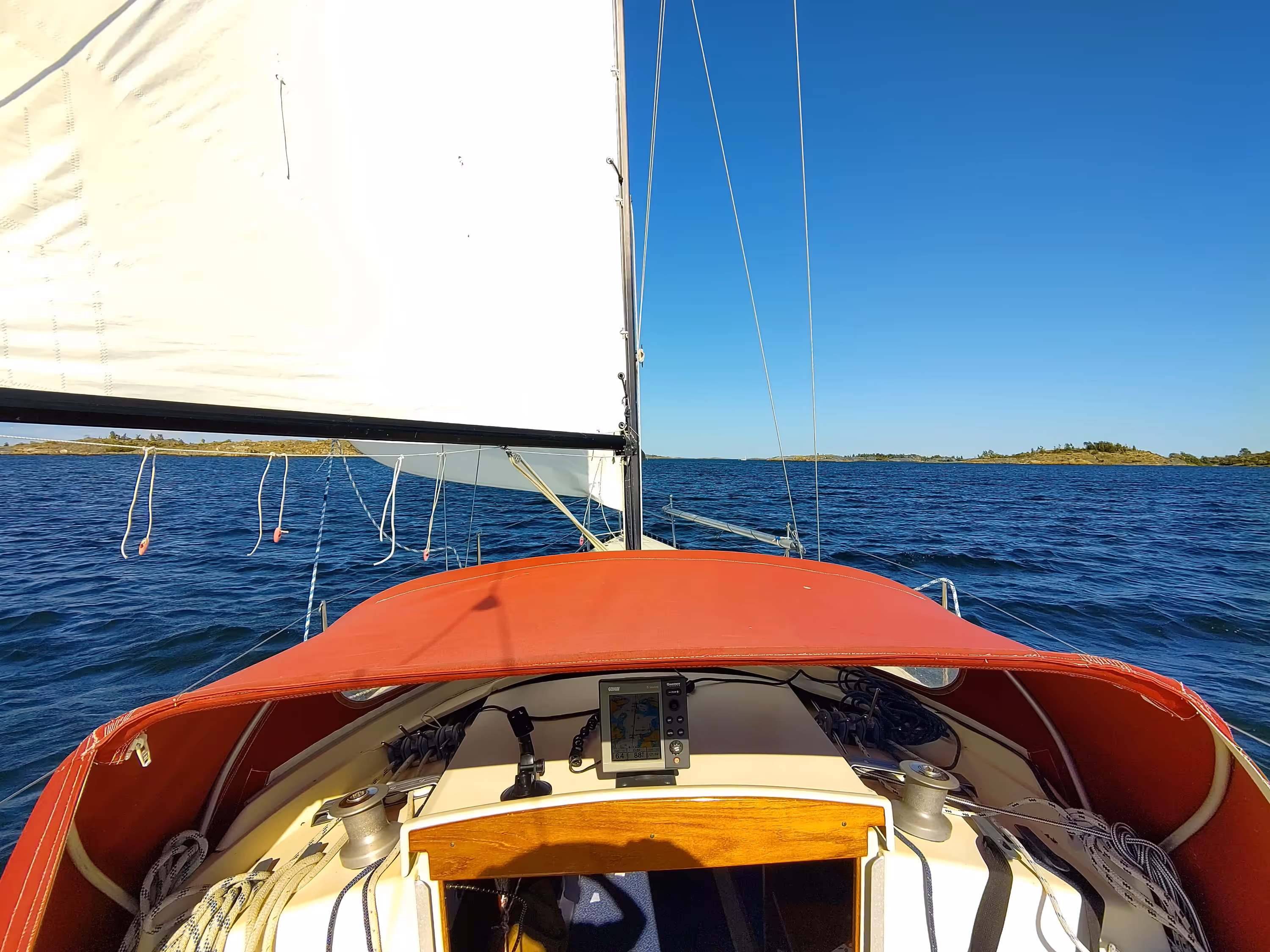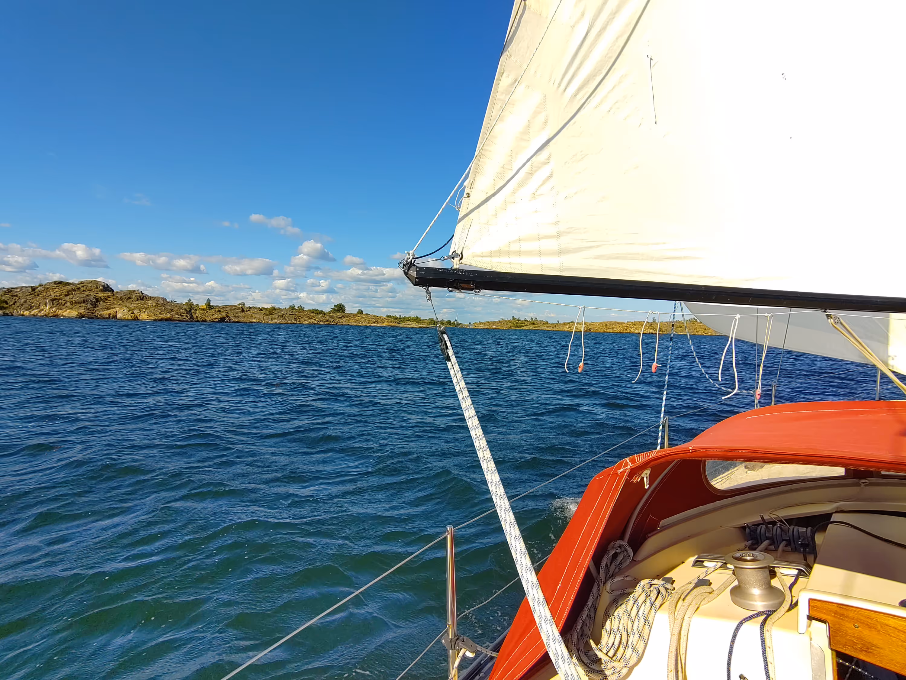I've made the first leg of hopefully many. Everything taking always longer than I thought, I left Grödinge quite late in the morning, and in very little wind. Many tacks later, I was finally out of the two small inlets and in Himmerfjärd. The wind picked up and became quite gusty, and these gusts were making the wind veer some 40-45°, enough to either becalm you or to transform a close-hauled into an over sheeted reach, that was making Elvira roll wildly. All in all, this part went quite OK.
