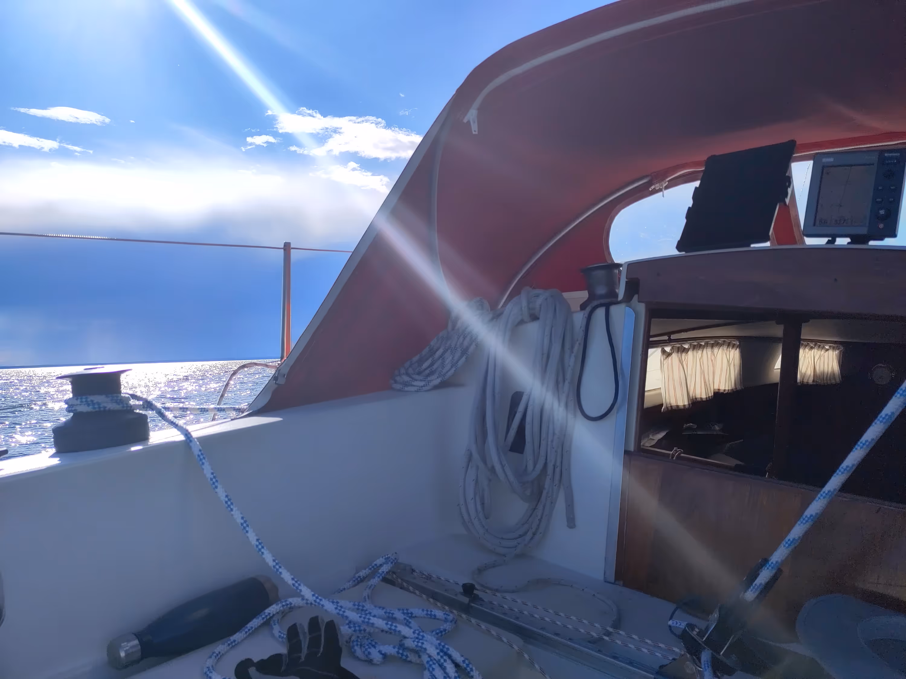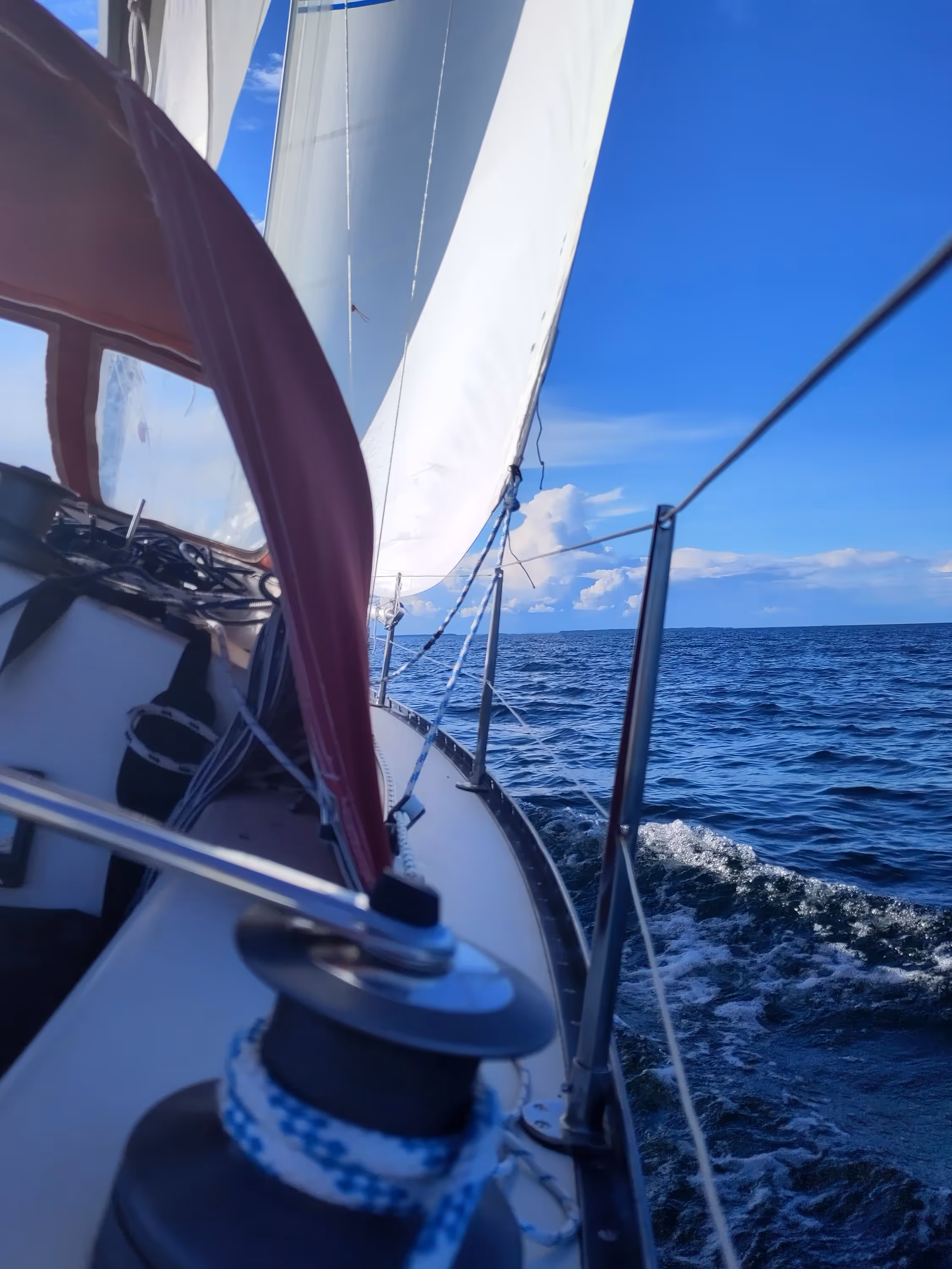 After getting up early and being a bit slow to get on, I was finally able to leave Björn island and hoist up the sails in a low but steady breath which only lasted from about 9 until 10:30 or something. At that point and until almost 15:00, it was just long waits on a flat as a windless lake sea with the occasional small breath. So I mostly did some crochet and managed to break my crochet… I'll have to fix it later.