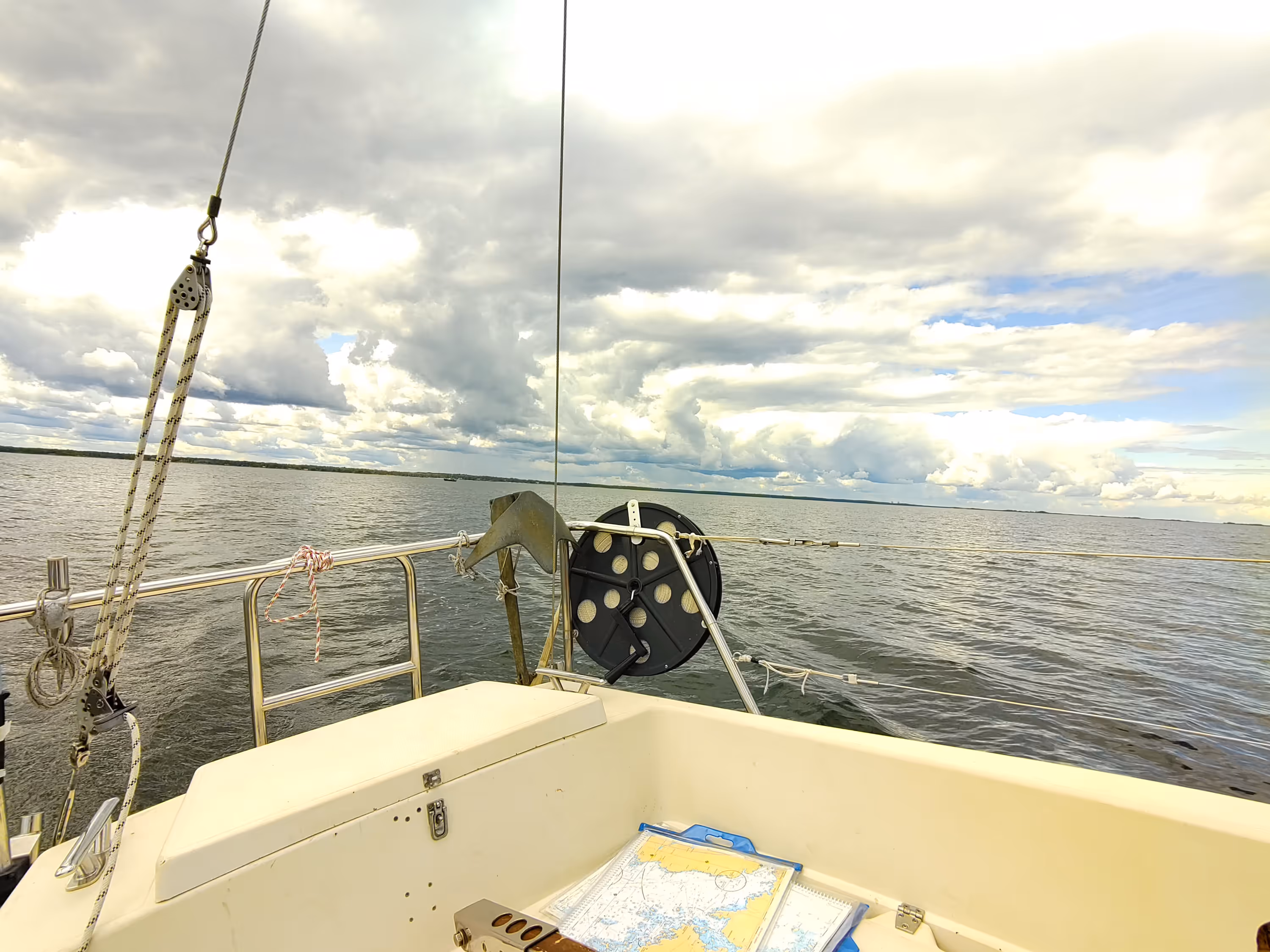 Today was supposed to be a lot of sail trimming to get the most out of little wind, and it started exactly like that. Next to no sea, enough wind to get to 4 knots of close-hauled for a while, while I could see and hear the thunder rolling on the coast far from me.
