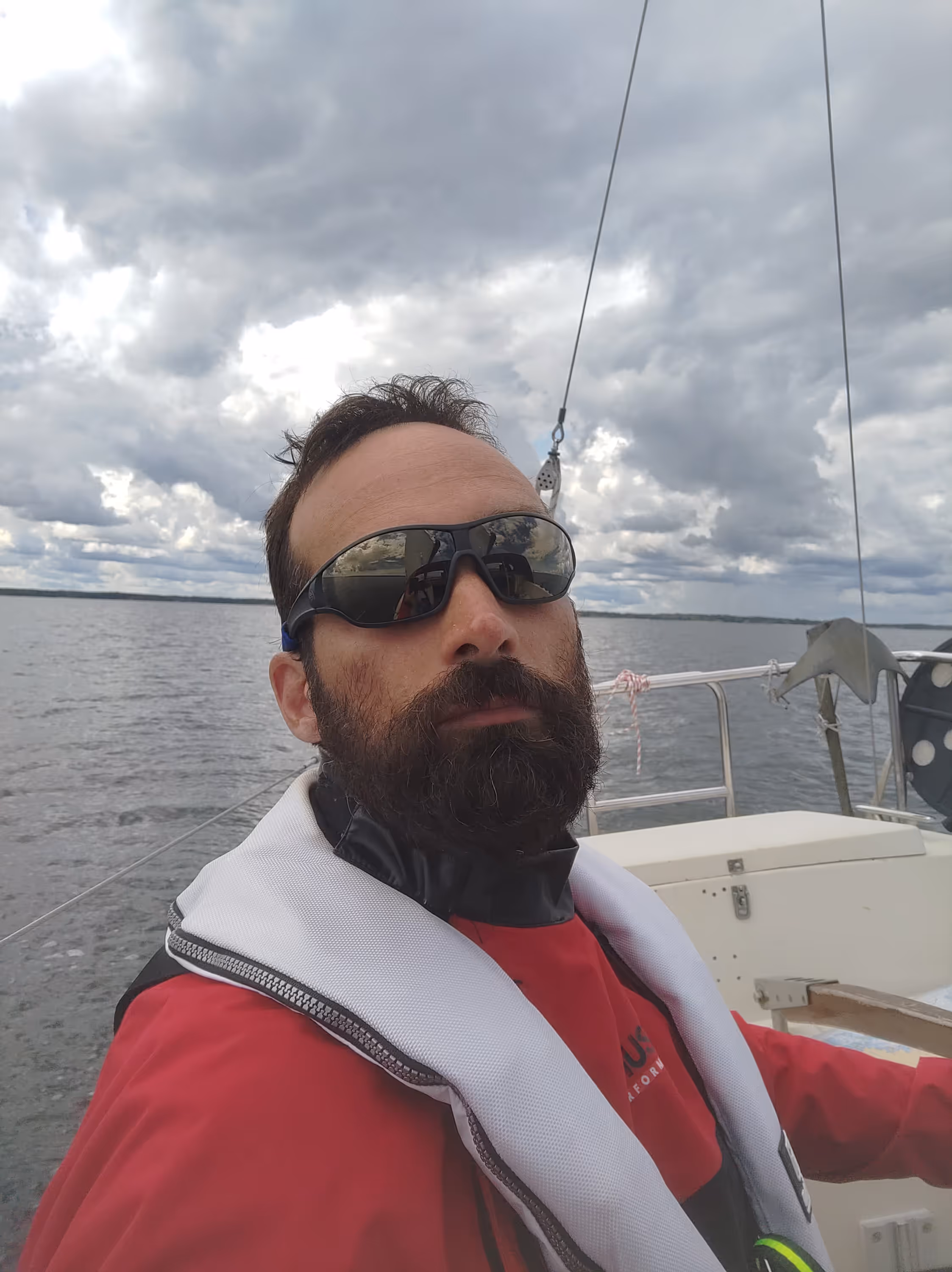 At some point the wind died down, but as it did so the sea increased. The sails kept sweeping from side to side under the combined effect of their weight and the roll of the boat induced by the sea. After a bit of that, I didn't like to keep waiting for some hypothetical wind. Another look at the forecast indicated that the place I was originally aiming for was now predicted to be in the middle of the thunder all night long. So I decided to put down the sail and motor my way to the closest buoy. Sadly, upon arriving there, I found out there was only one buoy there, and it was already taken. Not liking the option of doing 2h more on the engine, I opted to use the bow anchor. I played some harmonica to pass the time while I was checking the GPS to see if the anchor was holding or dragging. Once I felt relatively confident that it was holding, took a really quick dip to relax a bit. And now, I'll have an early dinner and get up a few times during the night to make sure all is OK. I also have set some geolocation alarms that will let me know if the boat moves from her current position.