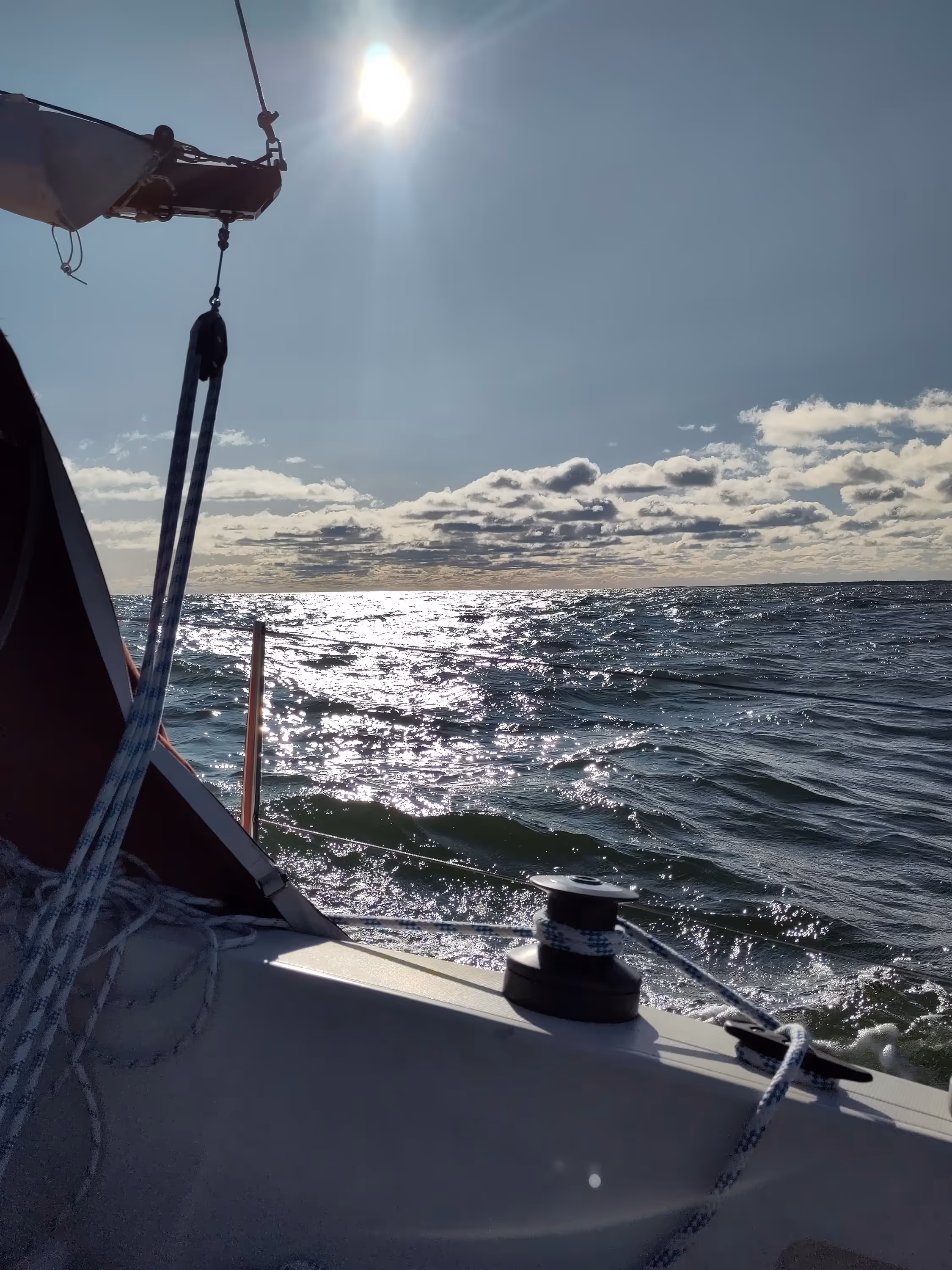 J'ai hissé la GV avec deux ris, et déroulé deux tiers du génois. Ça filait quand même à 7 nds comme ça, en surfant sur la houle comme un petit fou !