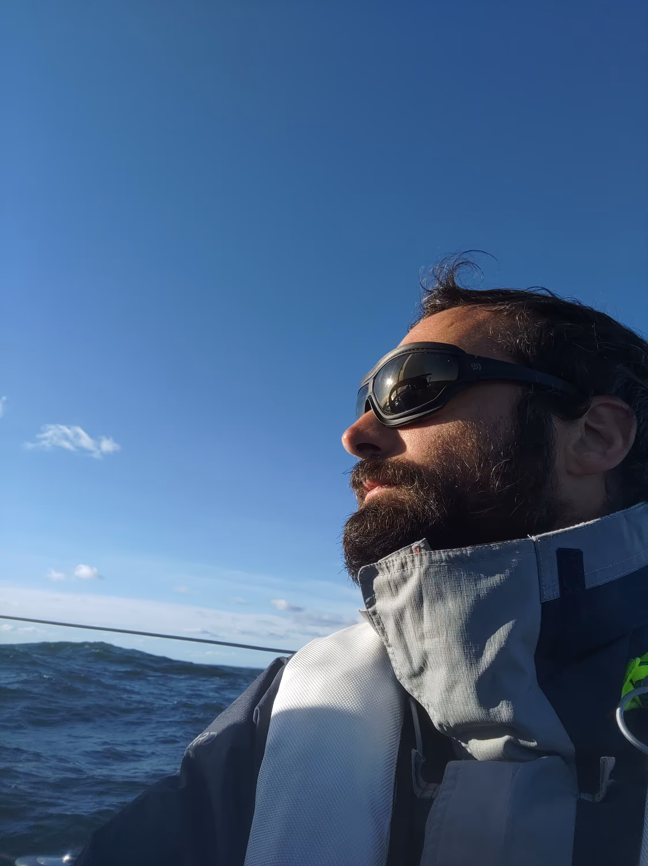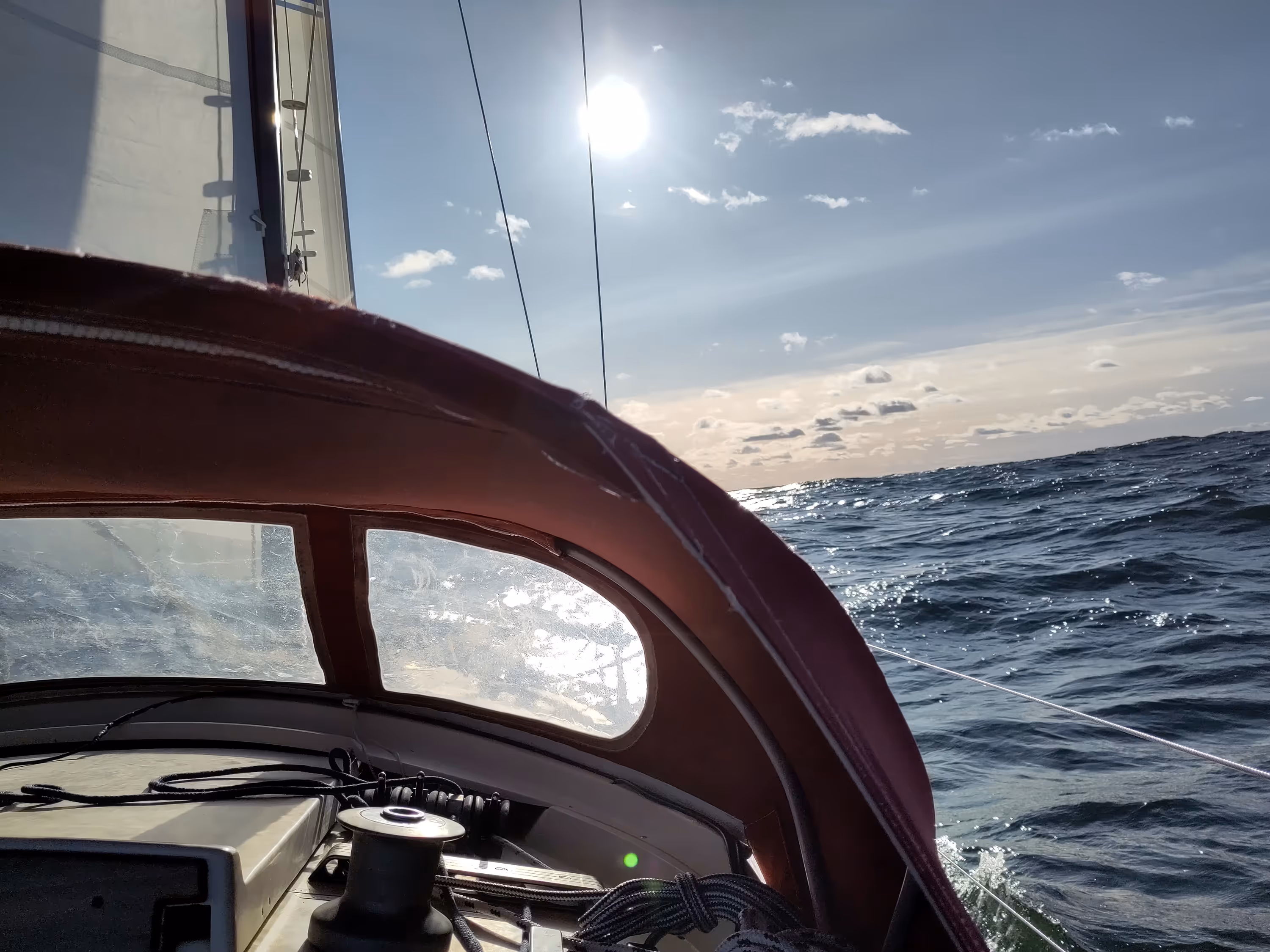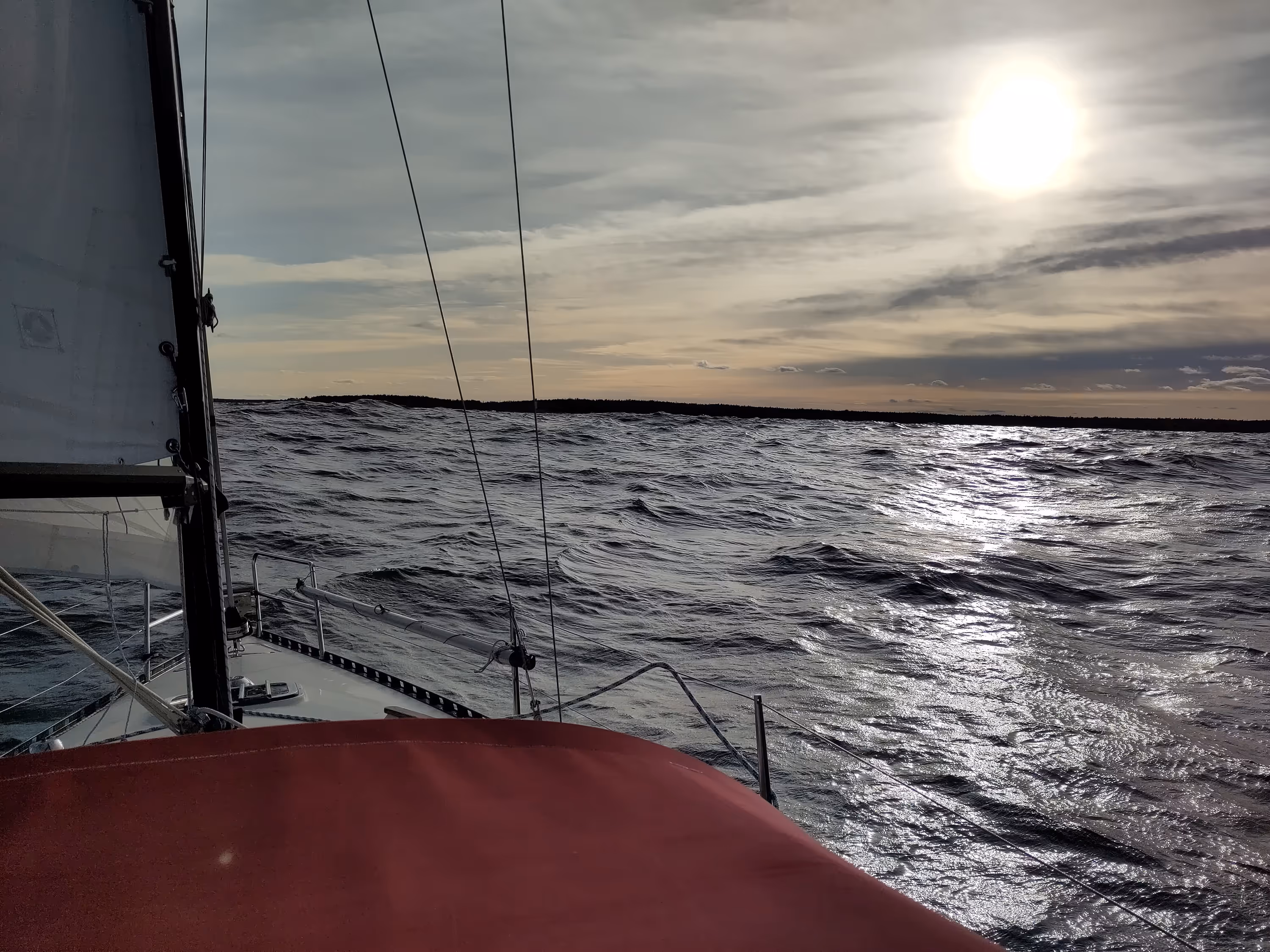 Le seul "problème" était que dans ces conditions (bcp de vent et de houle), impossible d'utiliser l'autopilote, ce qui a compliqué un peu le repas de midi, les pauses-café, etc. À quelques reprises, j'ai dû rouler le génois entièrement. Parfois parce que j'avais le vent trop dans le dos : la GV déventait le génois, et avec ce gros vent, quand le génois se remplissait de nouveau, ça faisait une grosse claque à la voile et ça ne me plaisait pas. Parfois pour pouvoir empanner (tourner vent dans le dos) plus simplement.