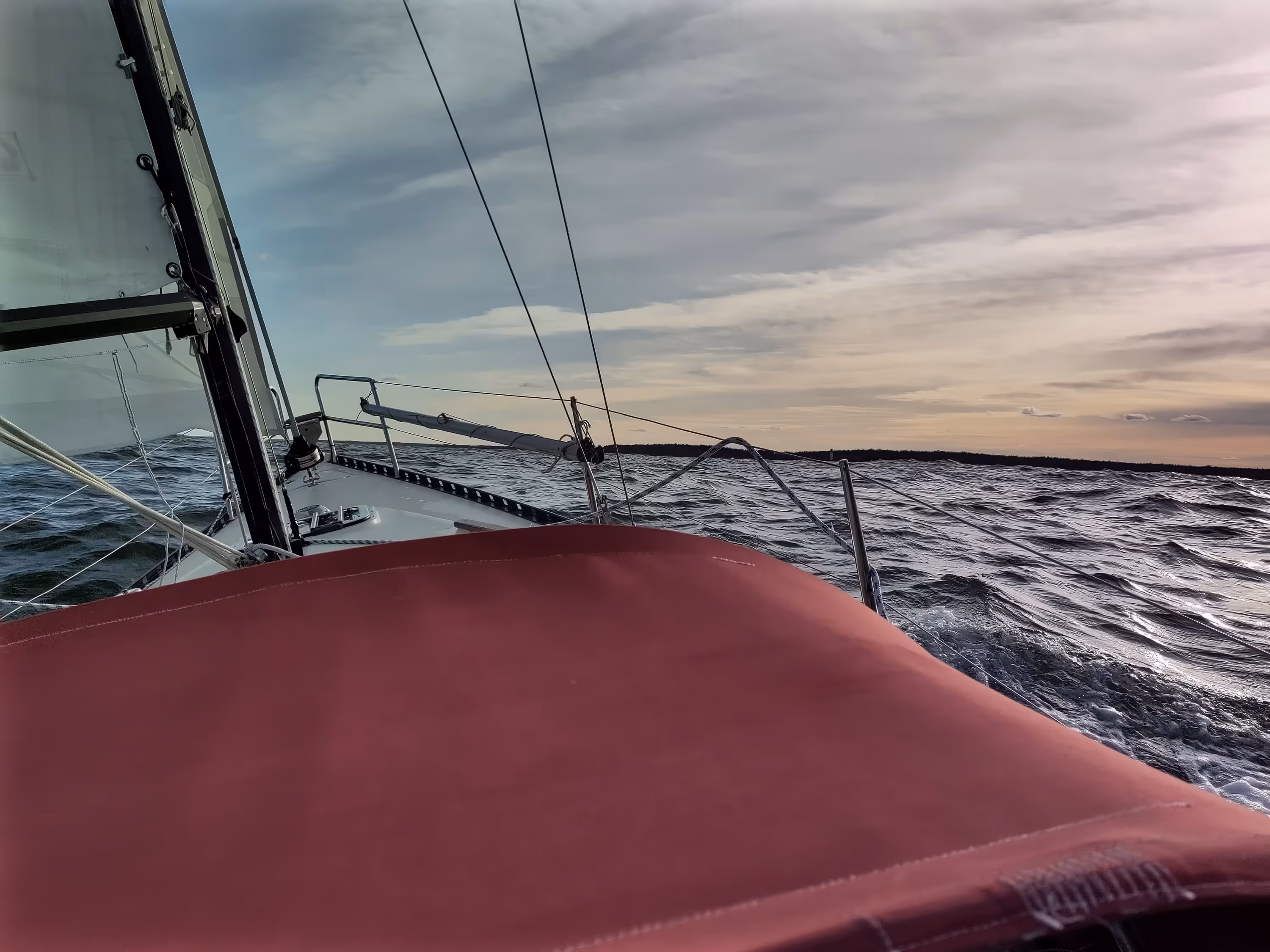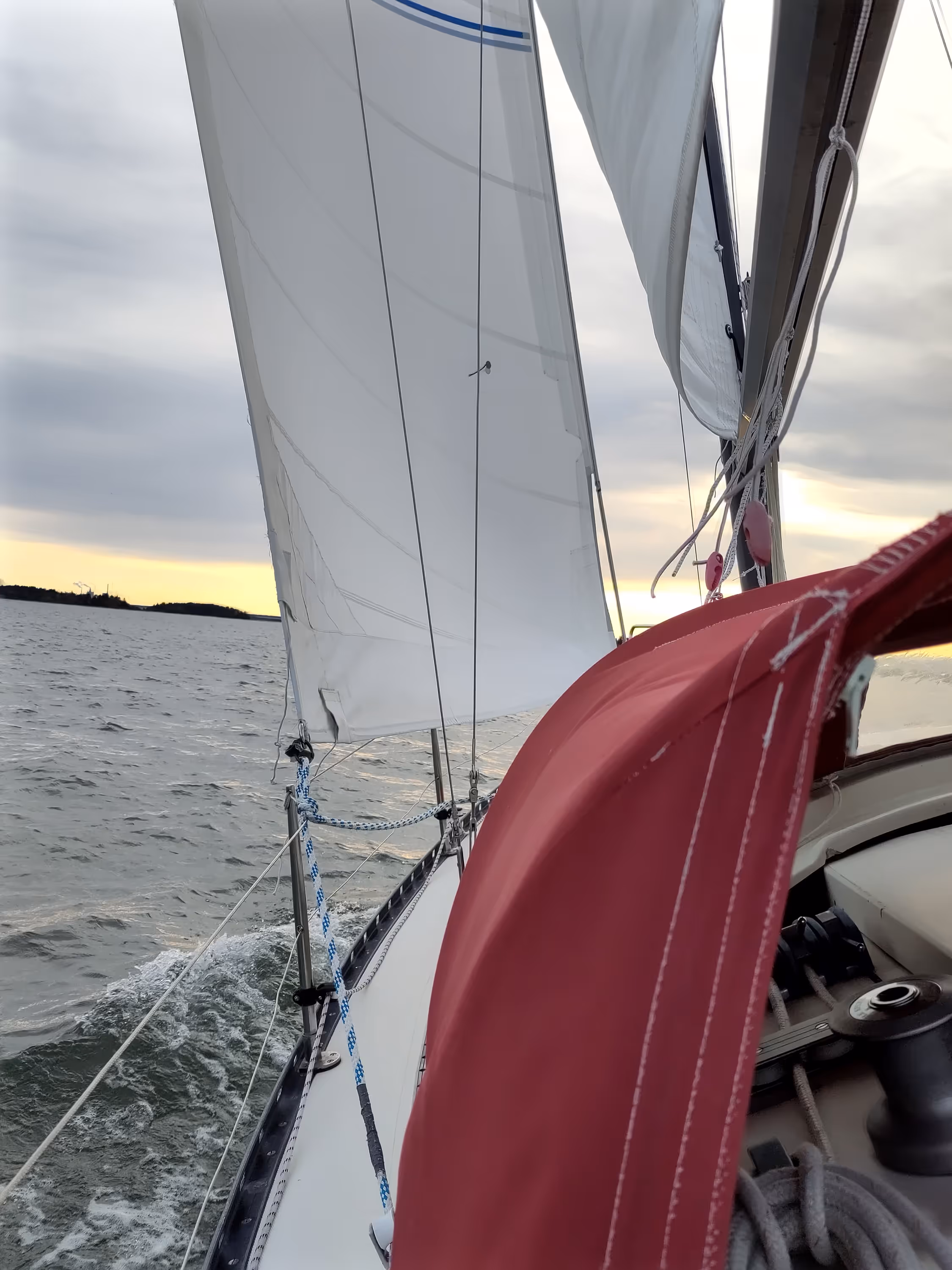 Après plusieurs heures, j'avais un peu moins de vent, mais ça n'a pas fait chuter la vitesse, c'était parfait. Je suis passé à côté de Storjungfrun en surfant, foncé le long de la côte jusqu'à Trödjehällan. Là, le "chemin" se rétrécissait vachement pour passer entre Trödjehällan et des rochers (Hällgrund). Avec la vitesse, ça faisait un peu penser à Mario Kart, quand il faut foncer dans un petit passage et ceux qui sont sur les côtés se fracasse dans les murs. Là, c'étaient les vagues qui se fracassant des deux cotés (malheureusement les photos/vidéos que j'ai prises des vagues ne rendent rien…).